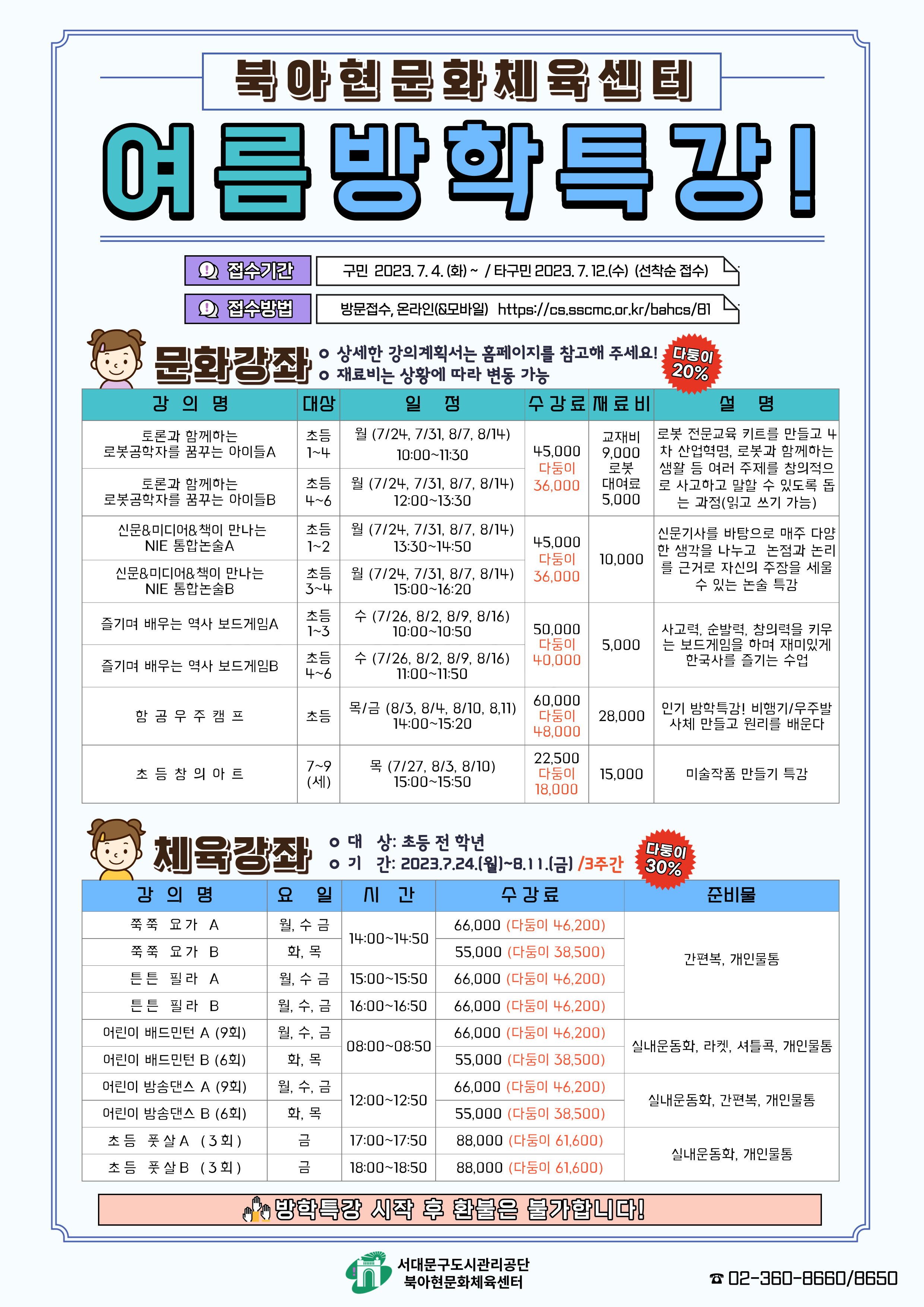 공지 2023년 북아현문화체육센터 여름방학특강 안내(문화/체육)