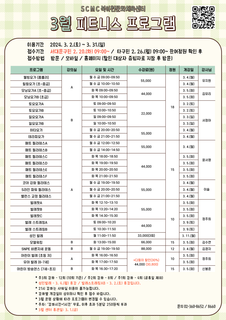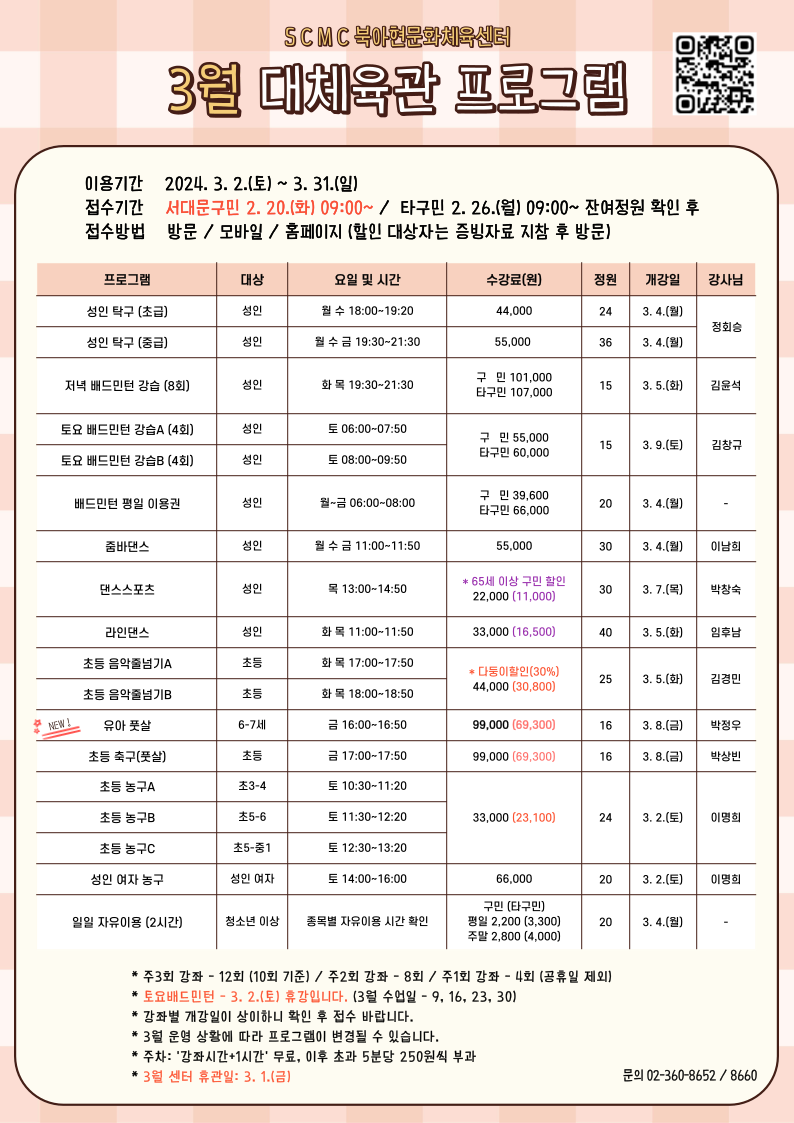 공지 북아현문화체육센터 3월 체육강좌 접수 안내