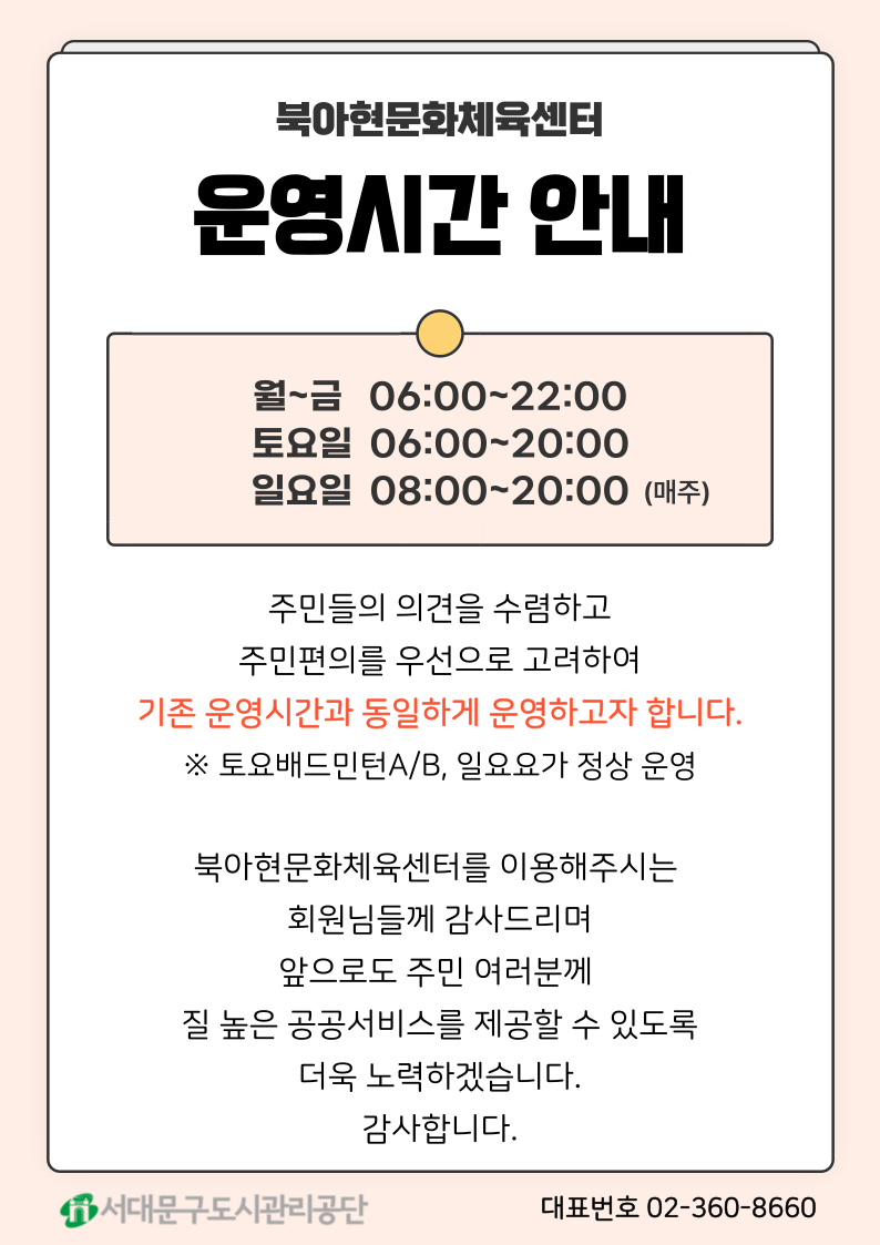 북아현문화체육센터 운영시간 변경 안내