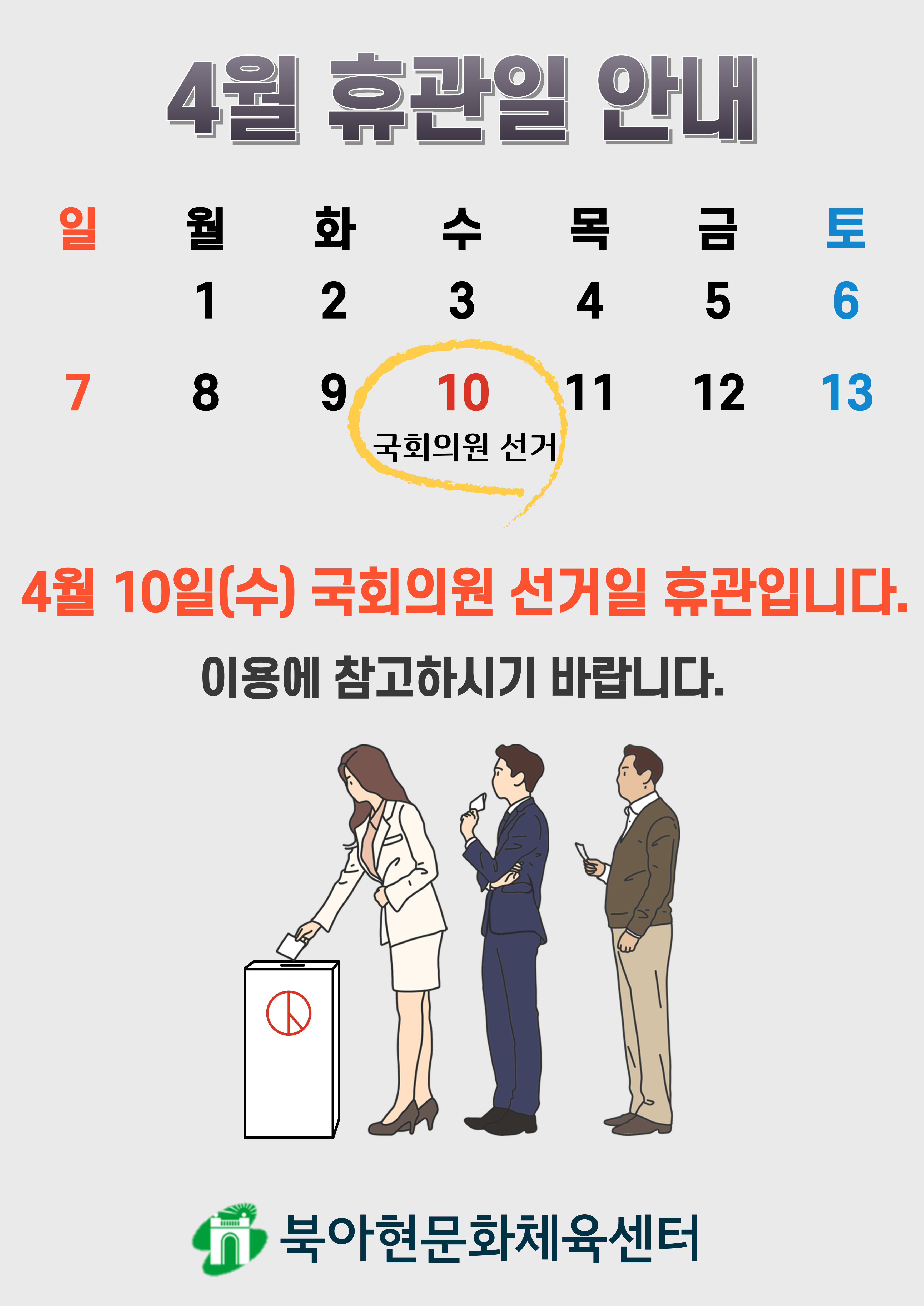 4월 10일(수)은 국회의원 선거일 휴관입니다.