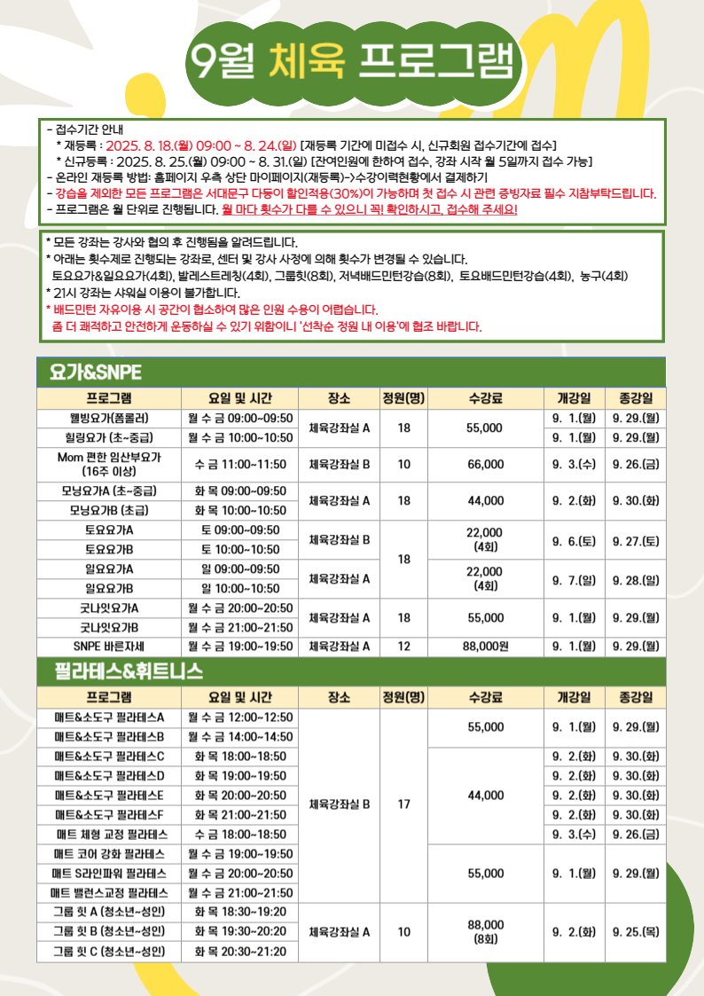 공지 북아현문화체육센터 9월 체육프로그램 접수 안내