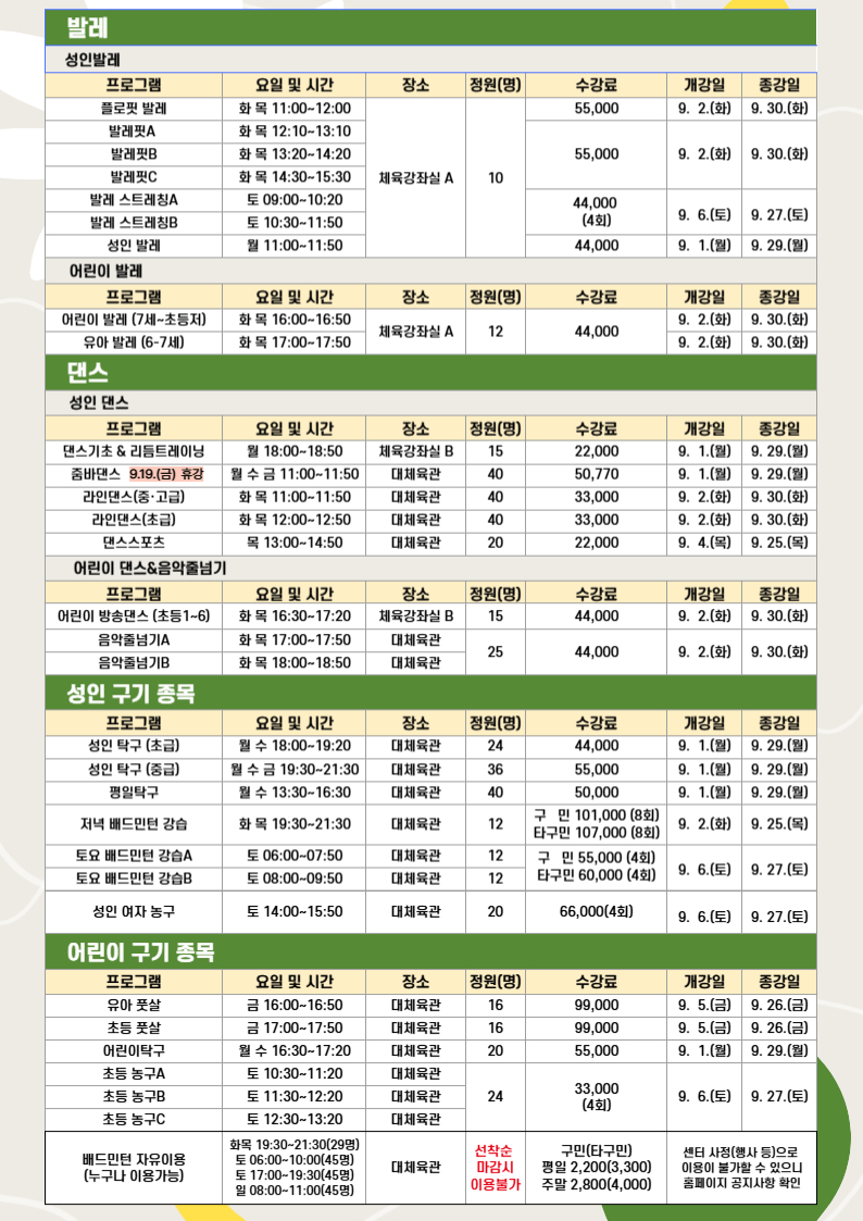 북아현문화체육센터 9월 체육 프로그램 접수 안내
