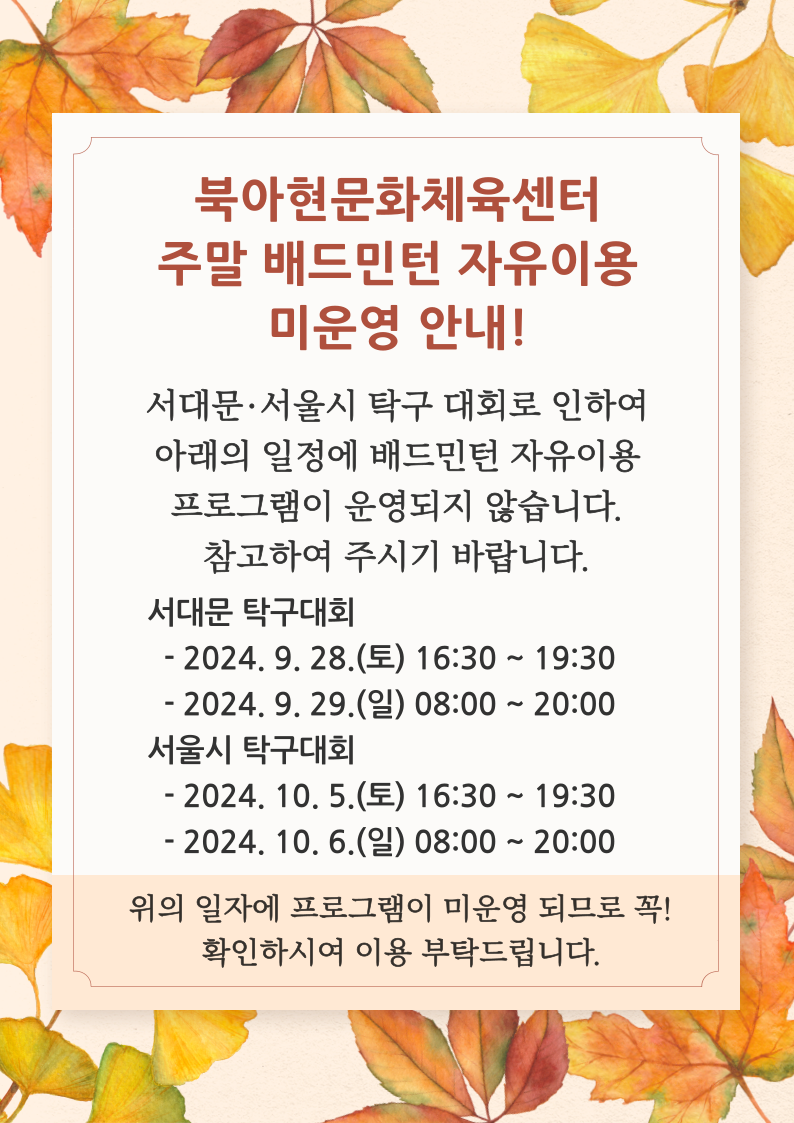 서대문구, 서울시 탁구대회로 인하여 주말 배드민턴 자유이용 미운영 안내!