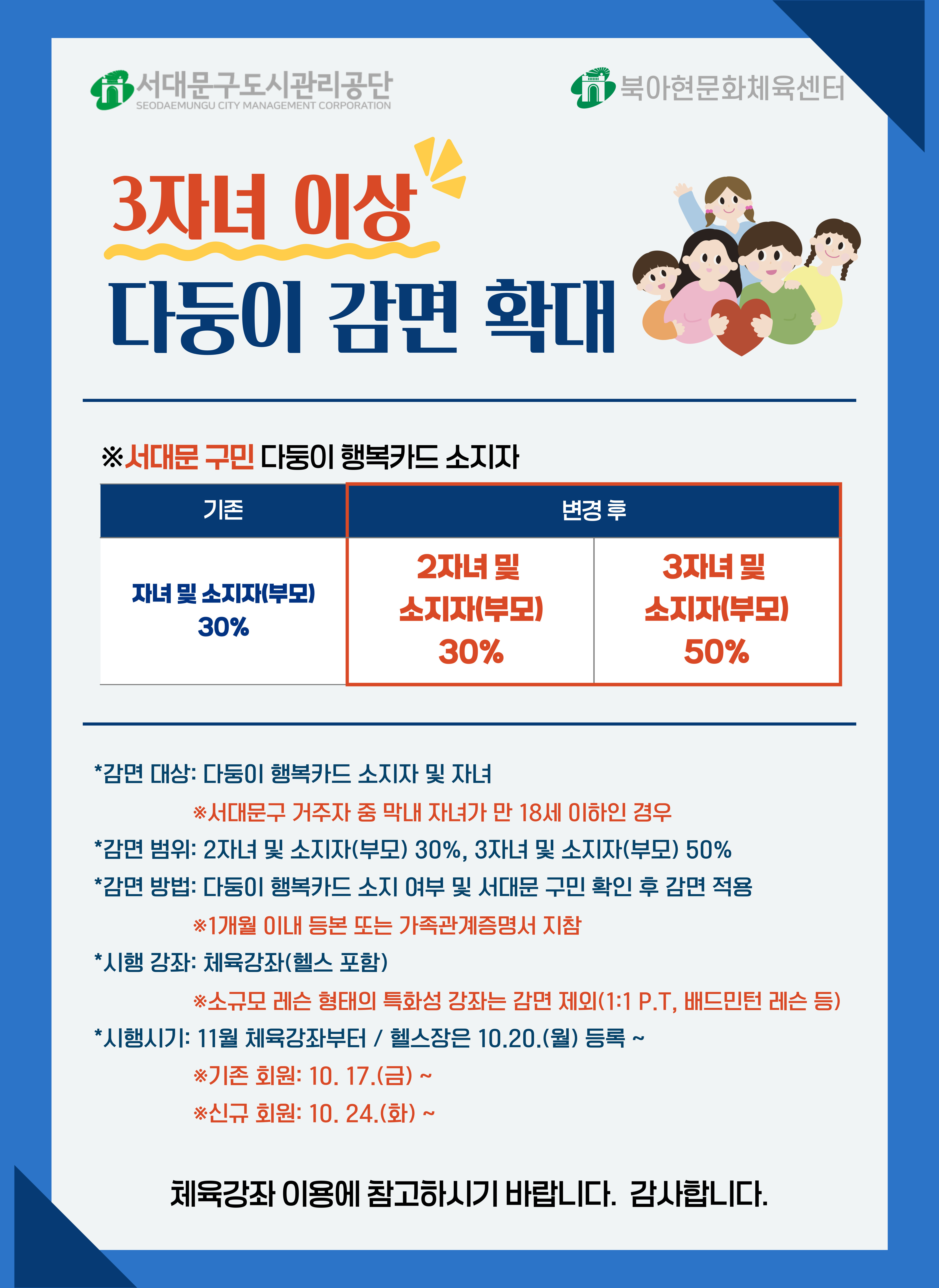 ★ 북아현문화체육센터 체육강좌 서대문구민 다둥이[3자녀 이상] 감면 확대 안내