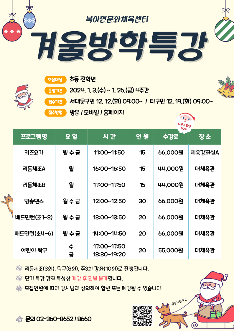강좌 북아현문화체육센터 겨울방학 체육 특강 안내