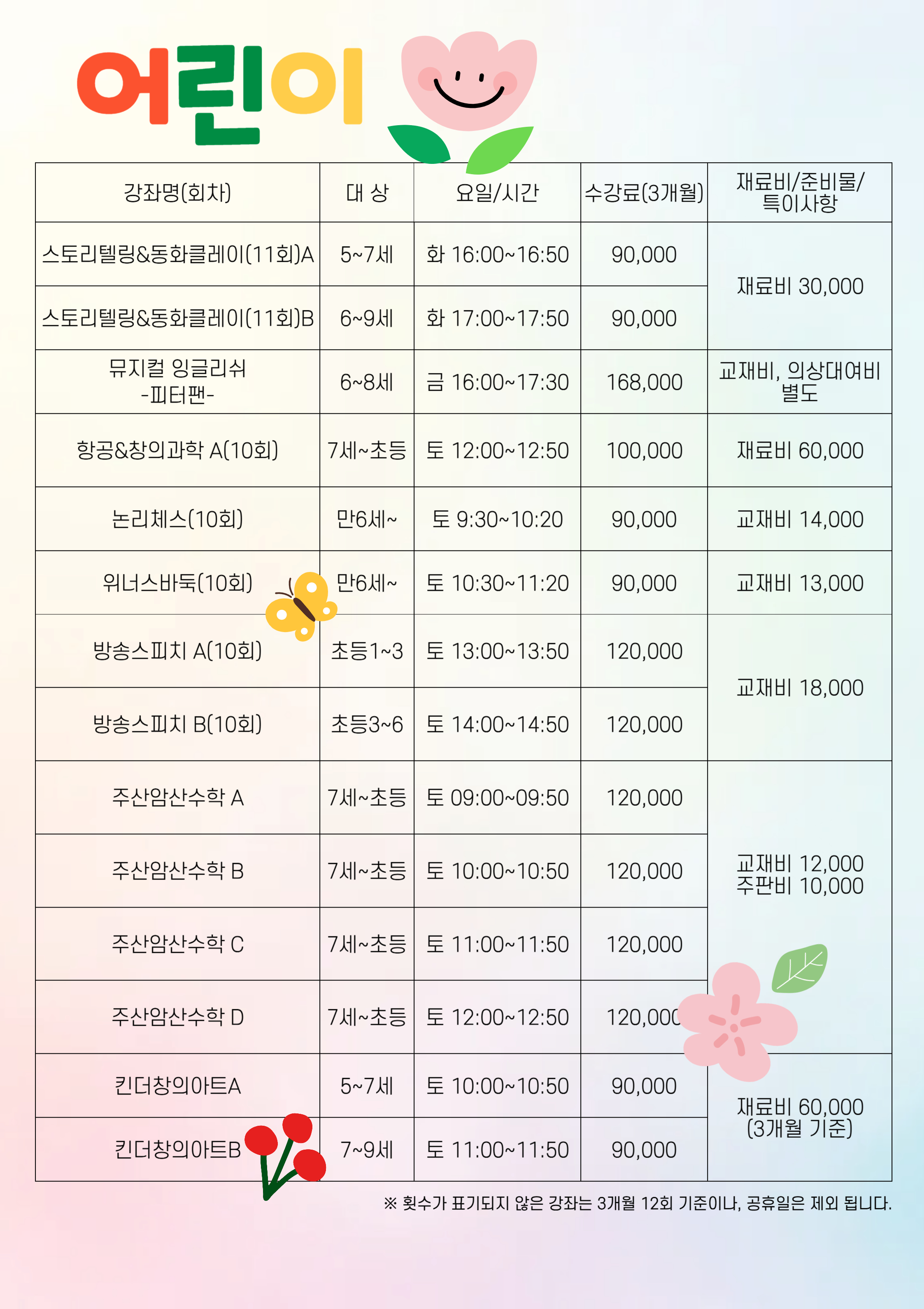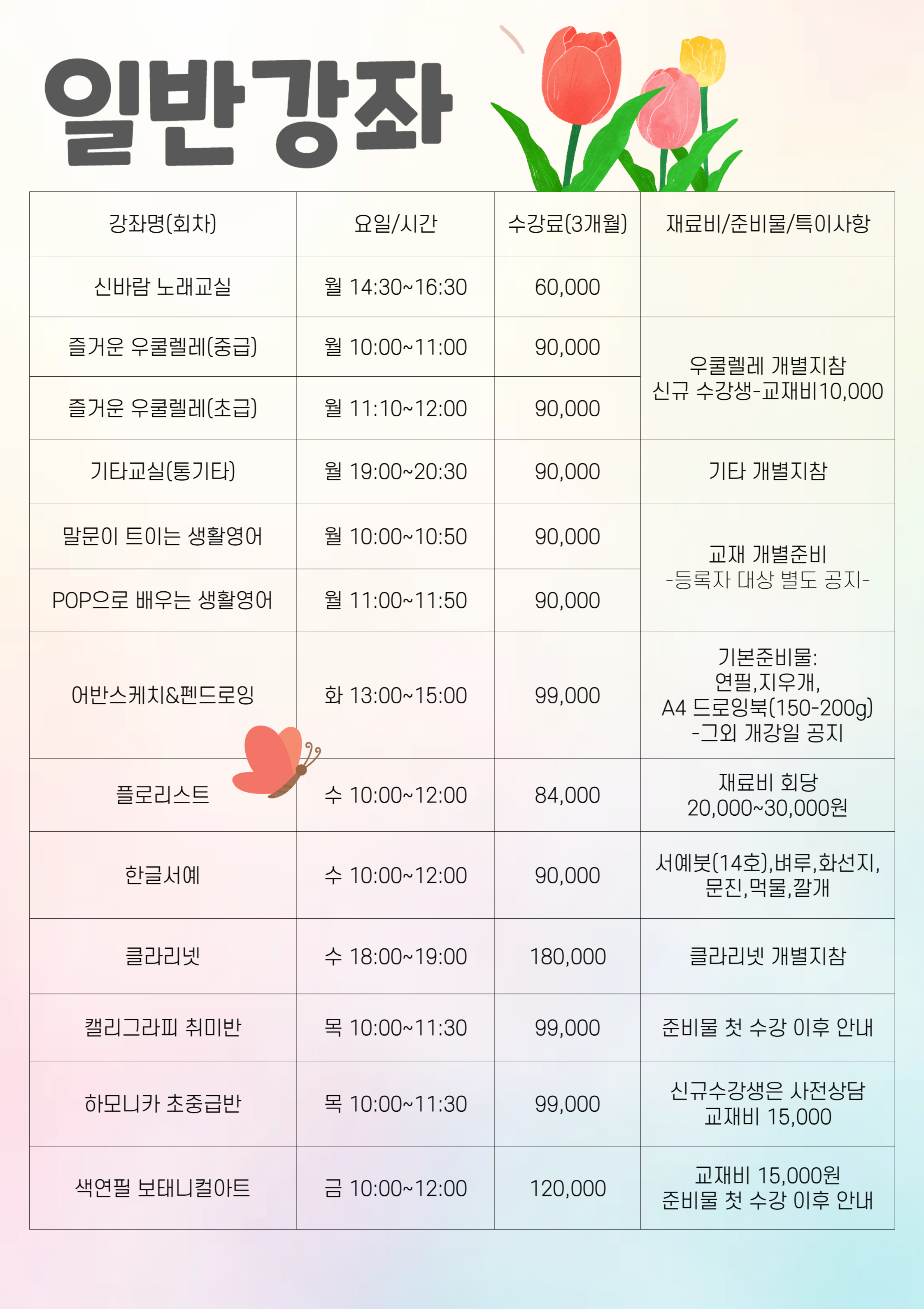- 강좌별 준비물, 개강일, 종강일, 휴강일이 다르니 확인 부탁드립니다 (추후 문자 개별 안내)