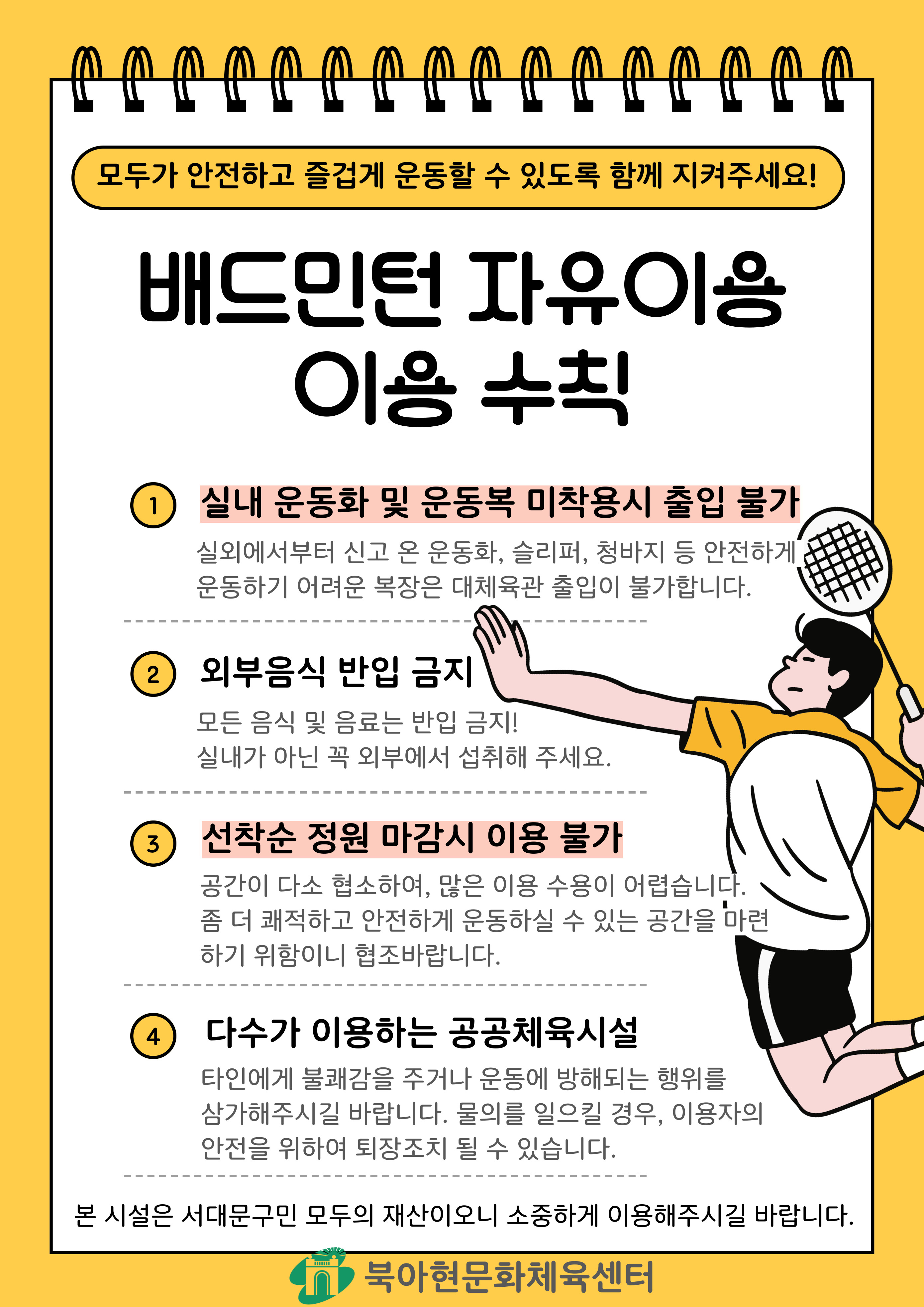북아현문화체육센터 4~5월 배드민턴 자유이용 안내 및 이용수칙 공지