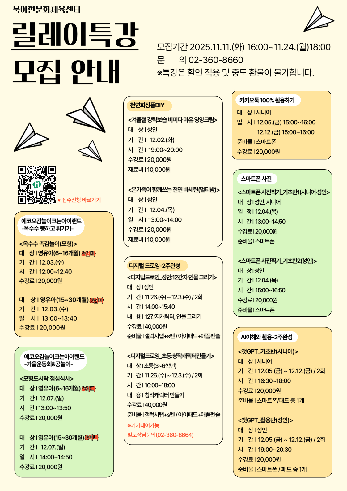 ★접수방법: 북아현문화체육센터 홈페이지>수강신청>문화강좌>릴레이특강