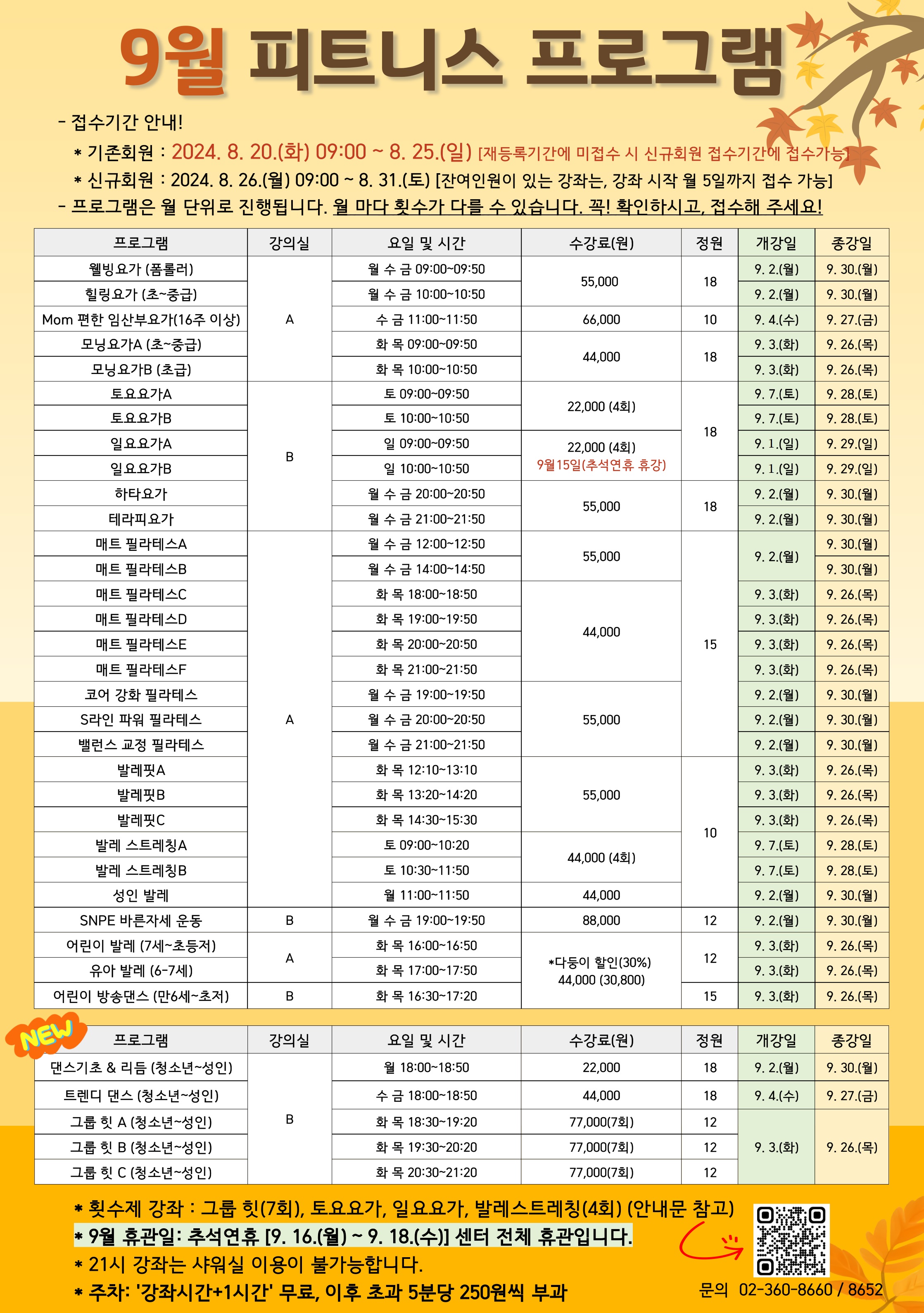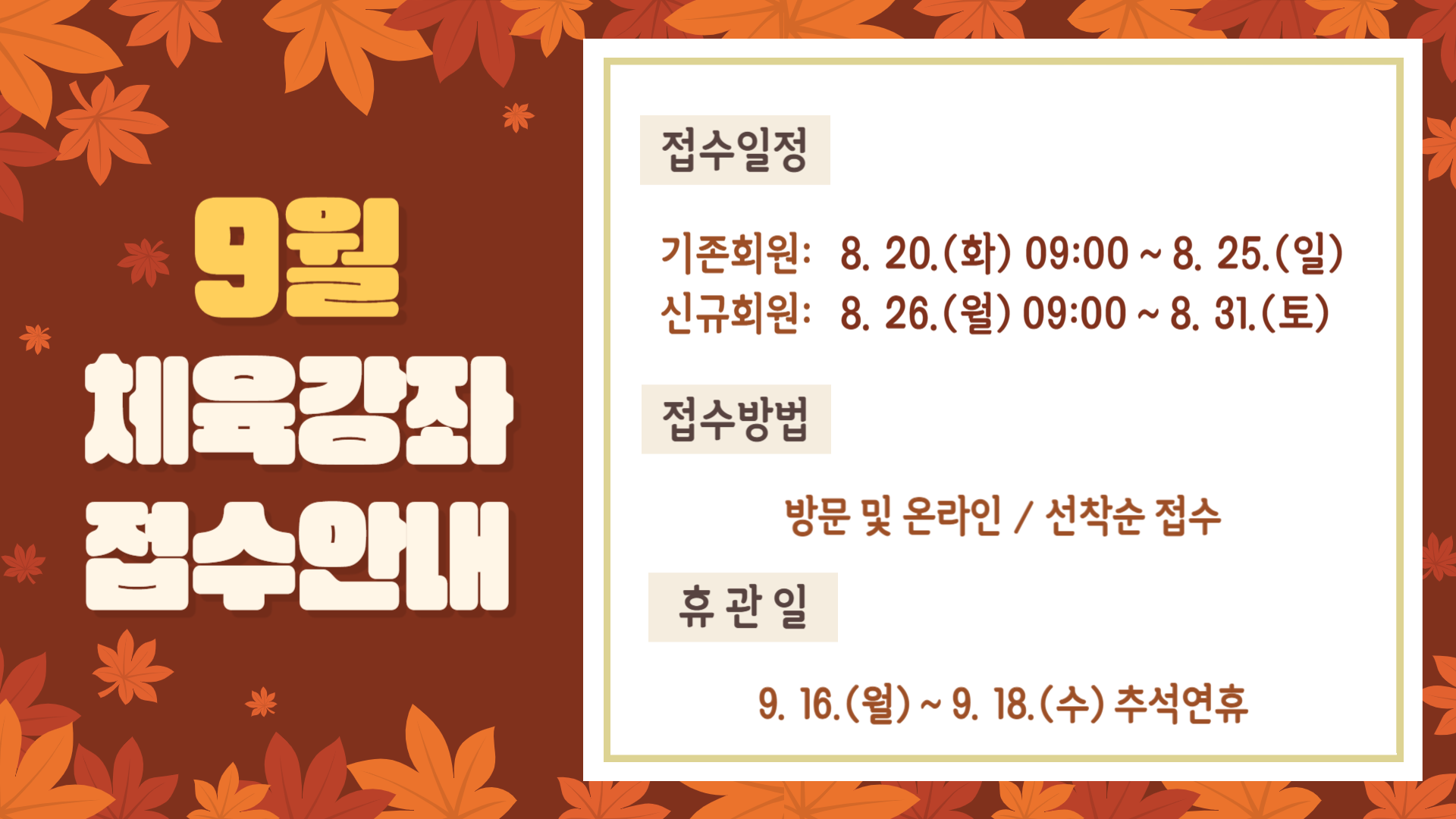 공지 북아현문화체육센터 9월 체육강좌 접수 안내
