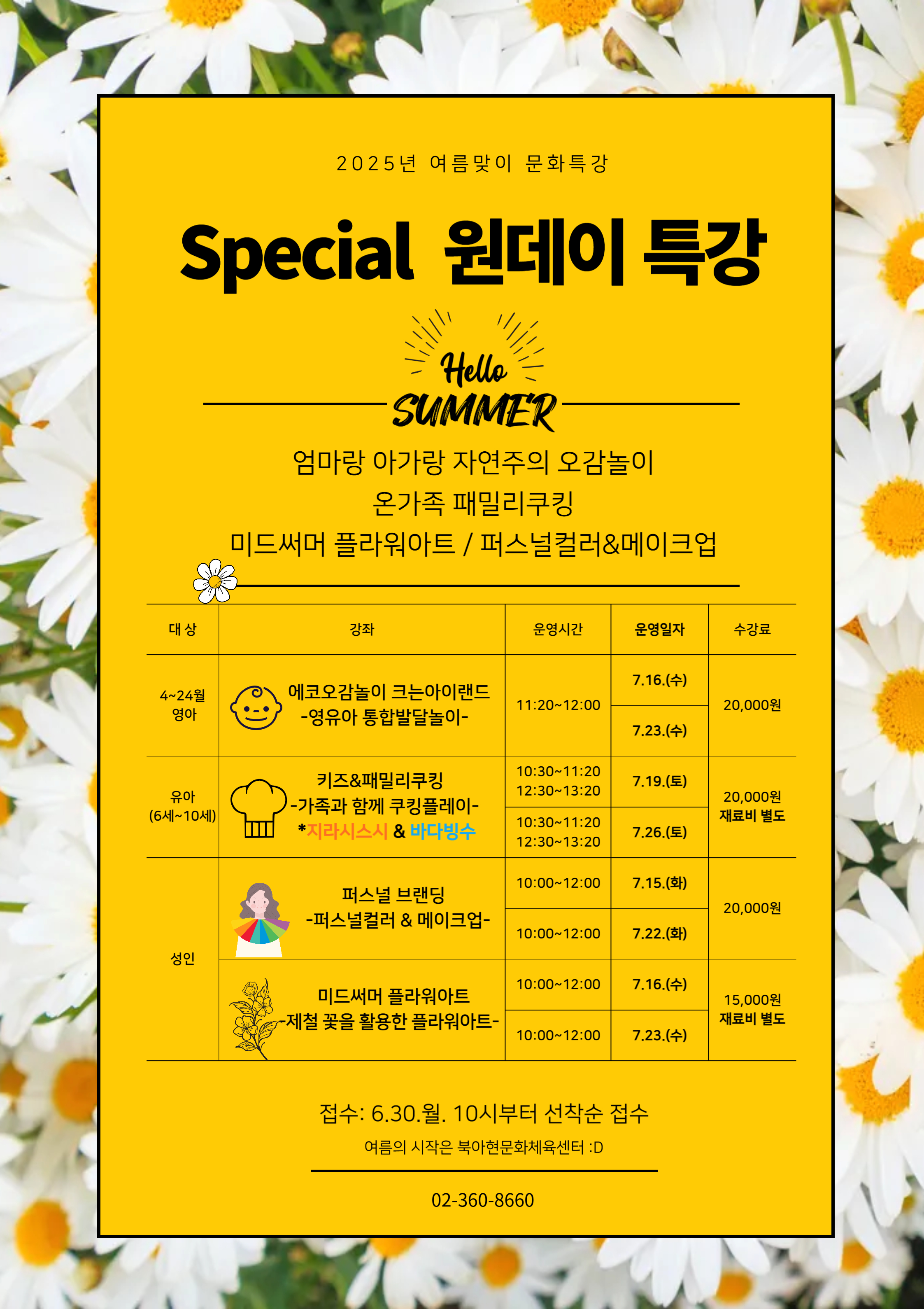 북아현문화체육센터에서 여름을 맞이하여 스페셜한 원데이 특강을 준비했습니다.
