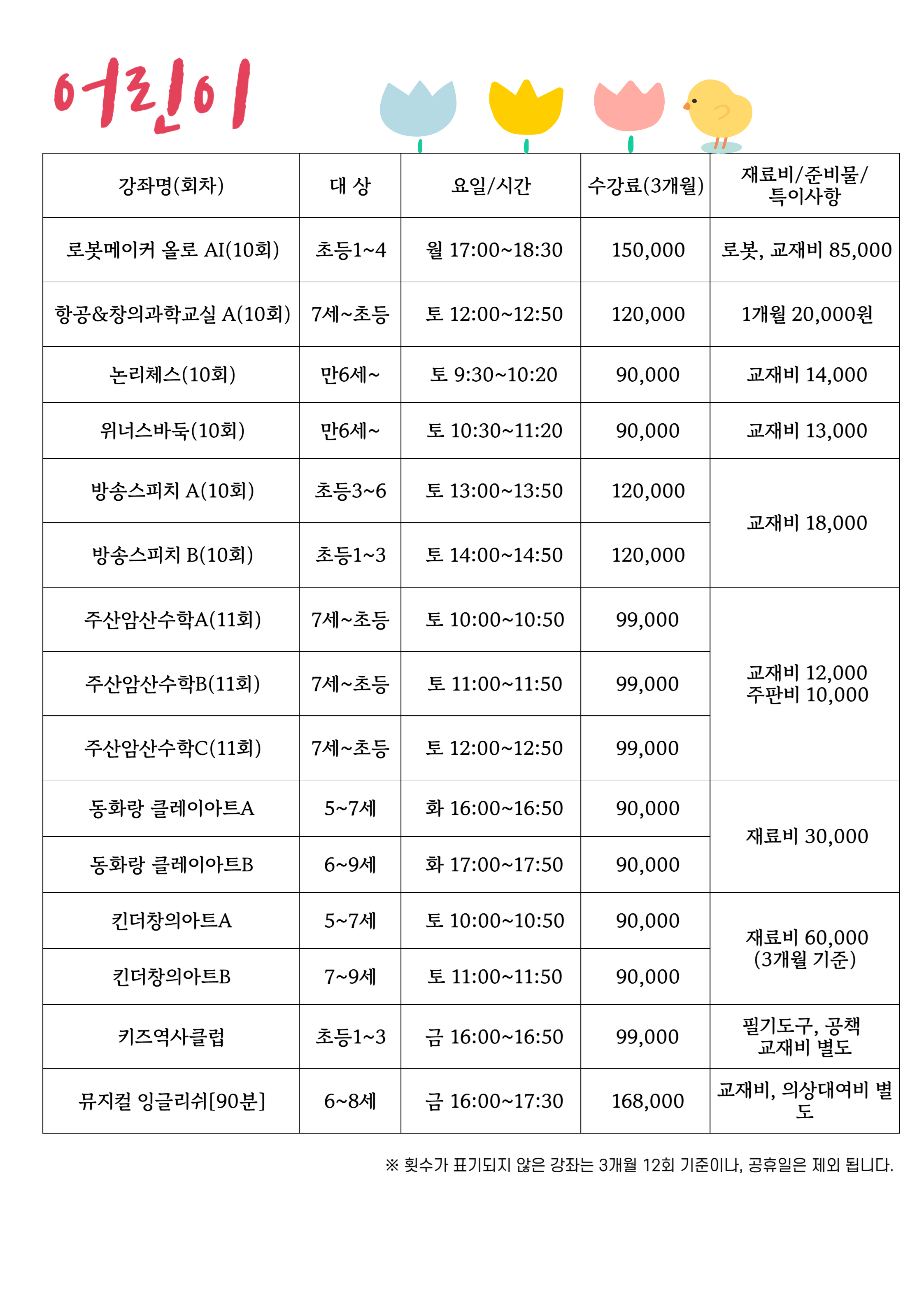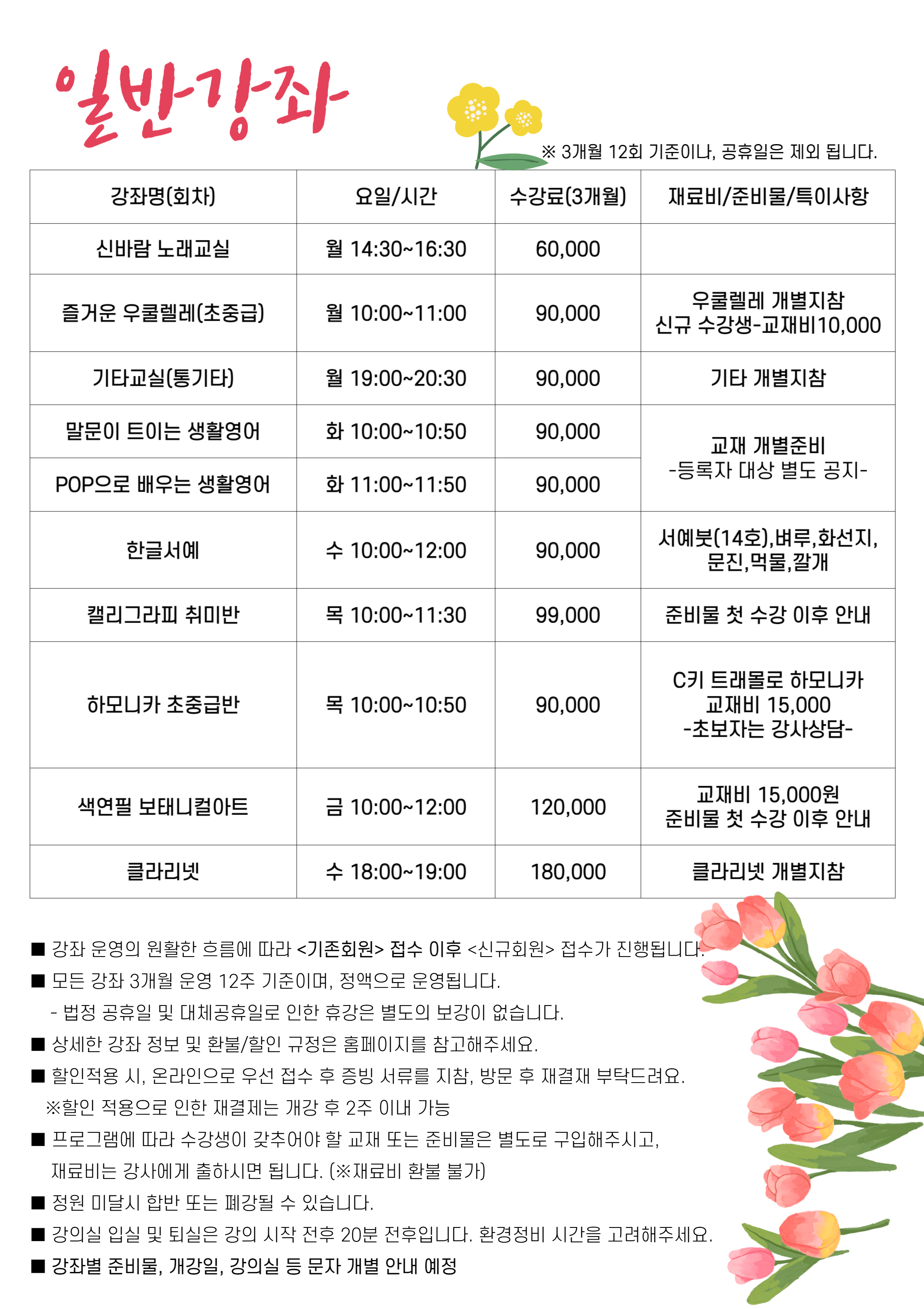 - 강좌별 준비물, 개강일, 종강일, 휴강일이 다르니 확인 부탁드립니다 (추후 문자 개별 안내)