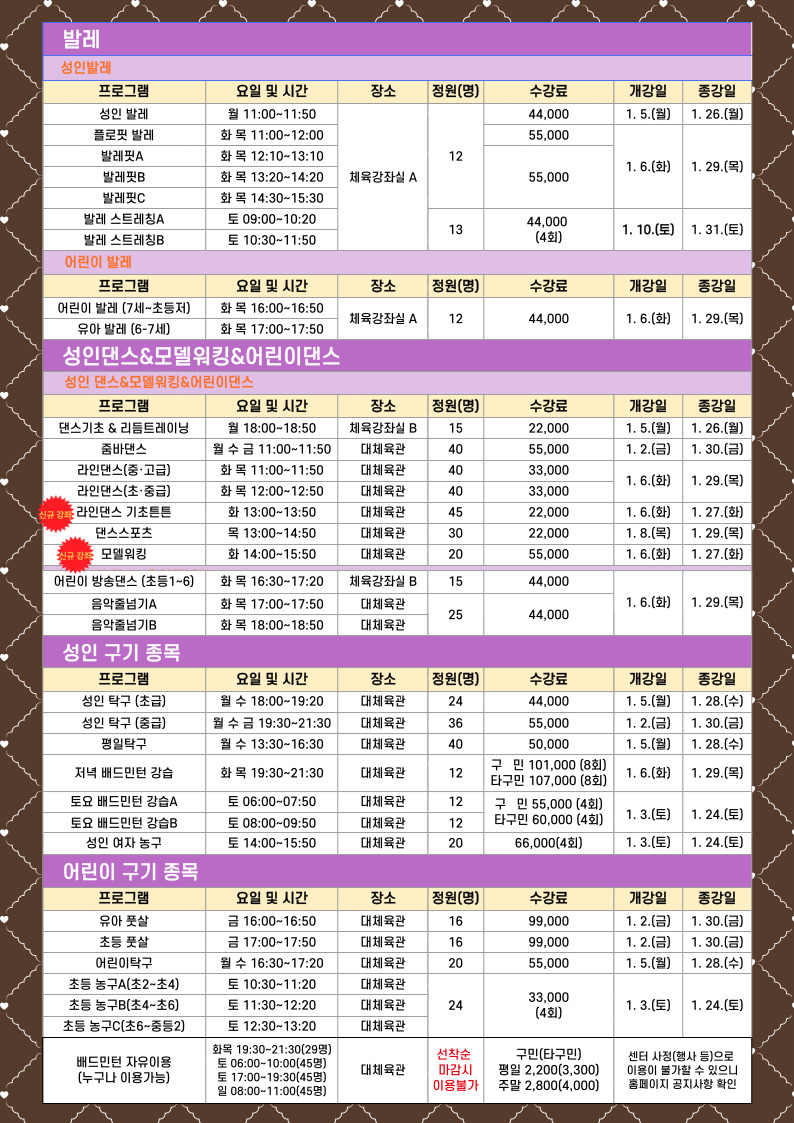 공지 북아현문화체육센터 1월 체육프로그램 접수 안내