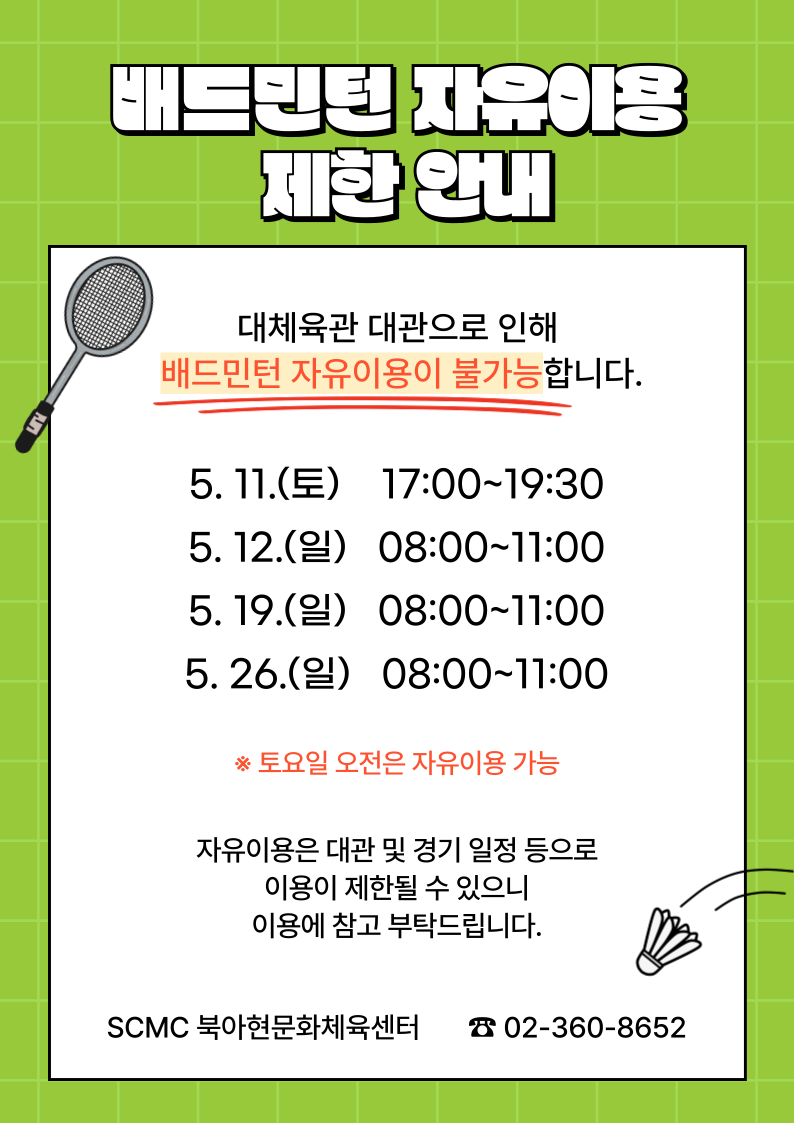 공지 북아현문화체육센터 5월 배드민턴 자유이용 안내