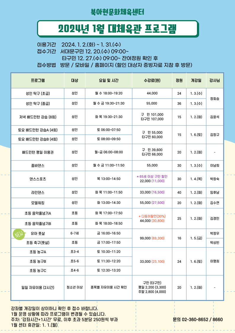 공지 북아현문화체육센터 2024년 1월 체육 프로그램 접수 안내