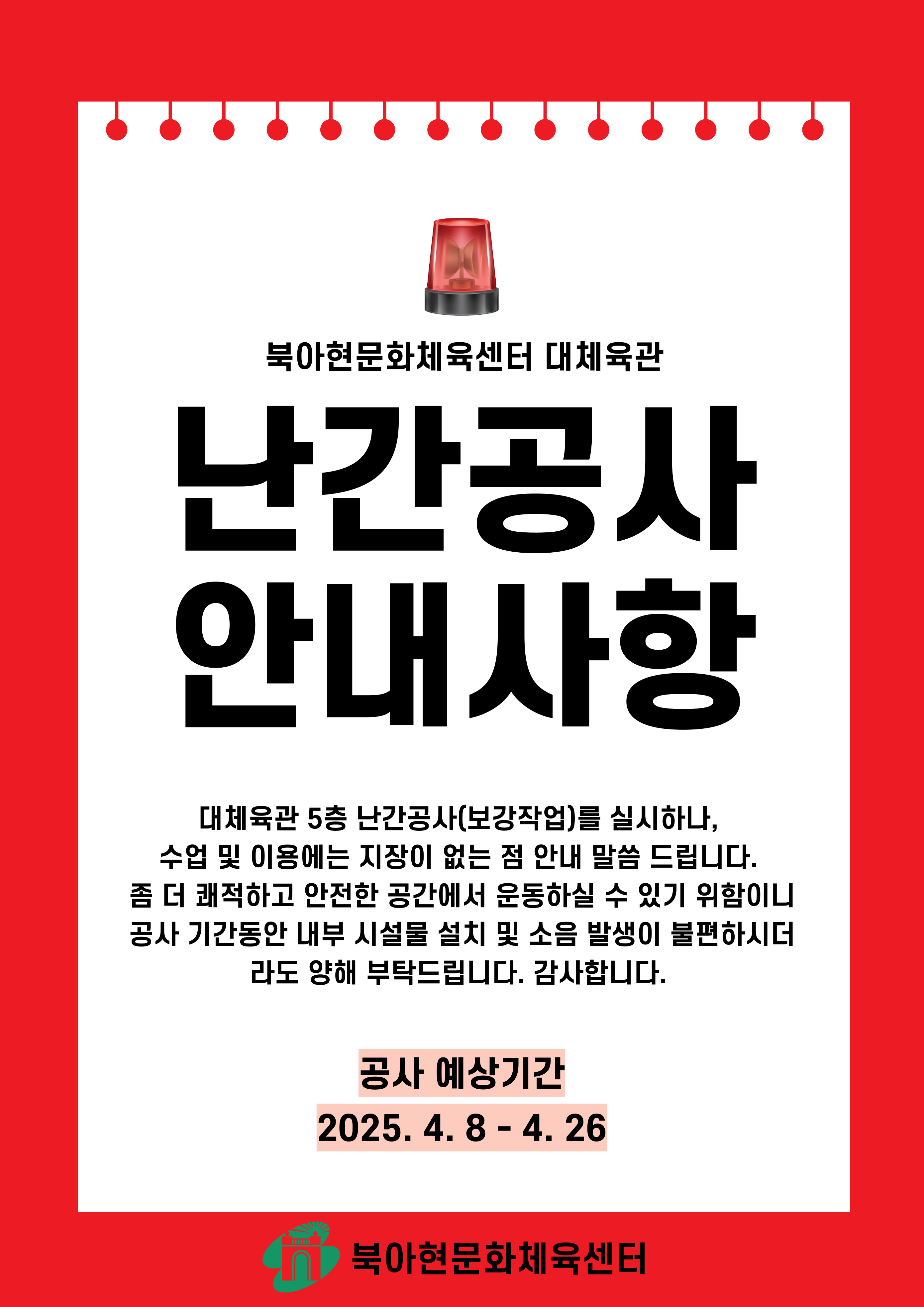 대체육관 수업 및 이용에는 지장 없으나, 추후 약간의 소음이 발생할 수 있으니 회원님들의 양해 부탁드립니다.