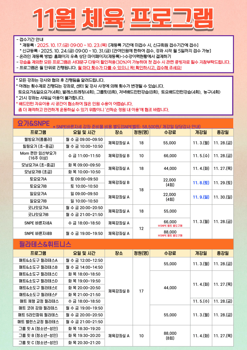공지 북아현문화체육센터 11월 체육 프로그램 접수 안내