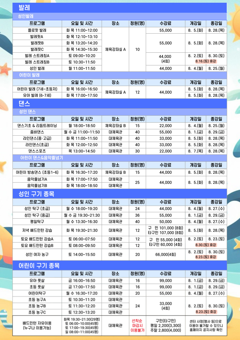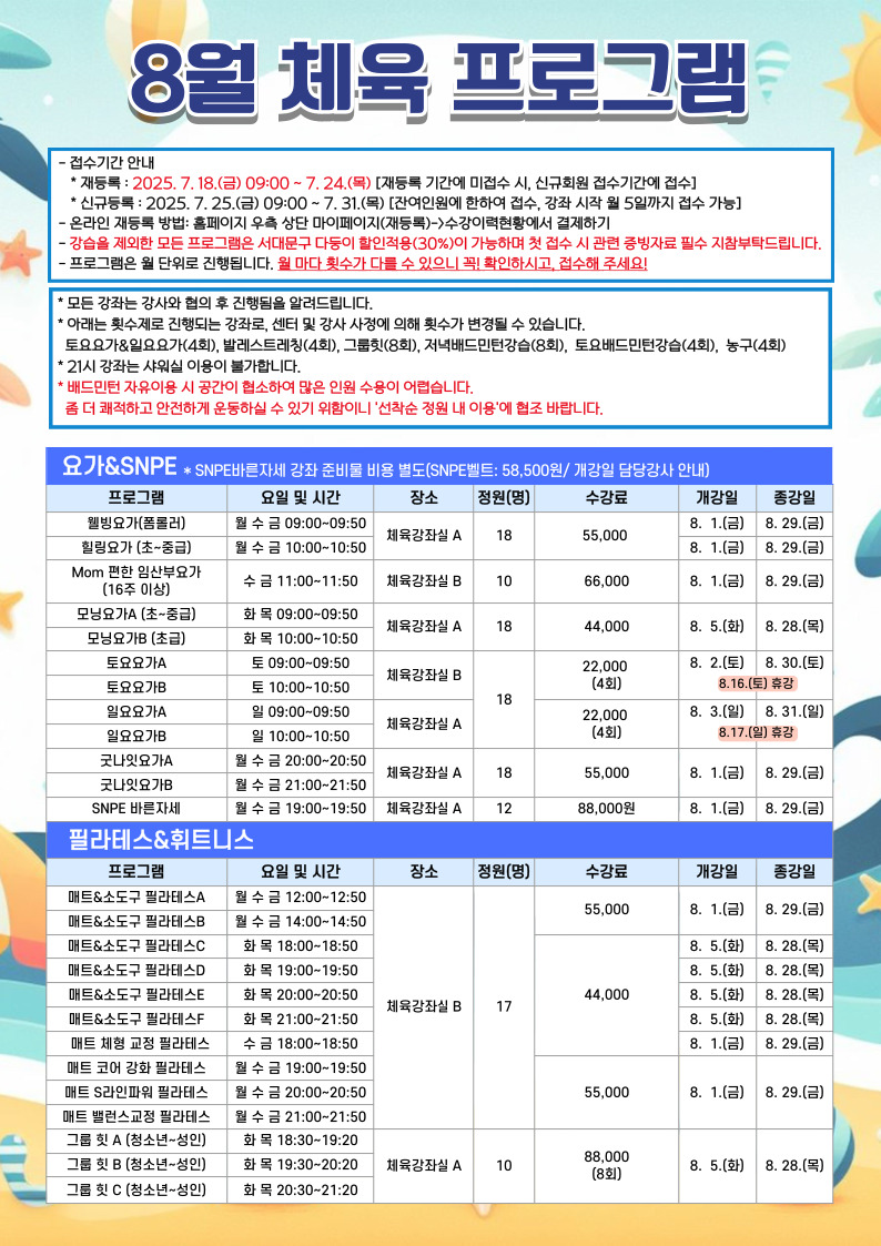 북아현문화체육센터 8월 체육 프로그램 접수 안내