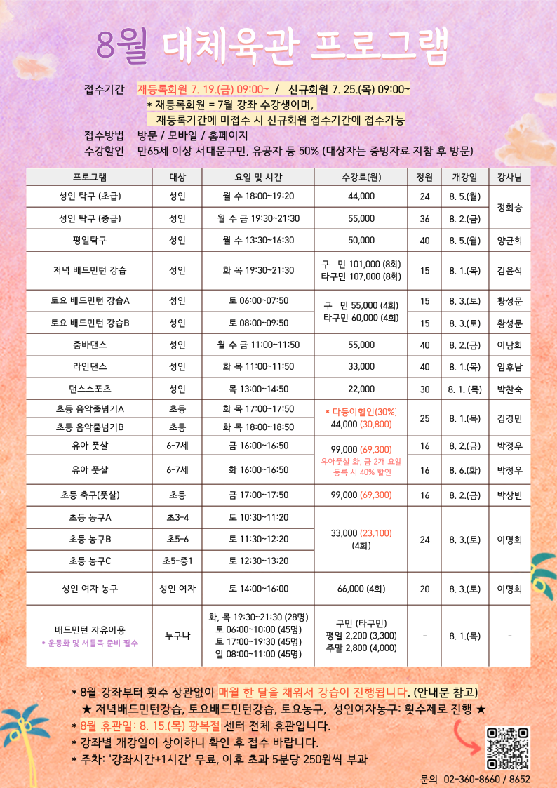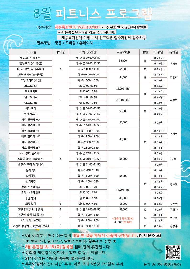 8월 체육강좌 접수기간 및 방법을 꼭 확인해주세요!