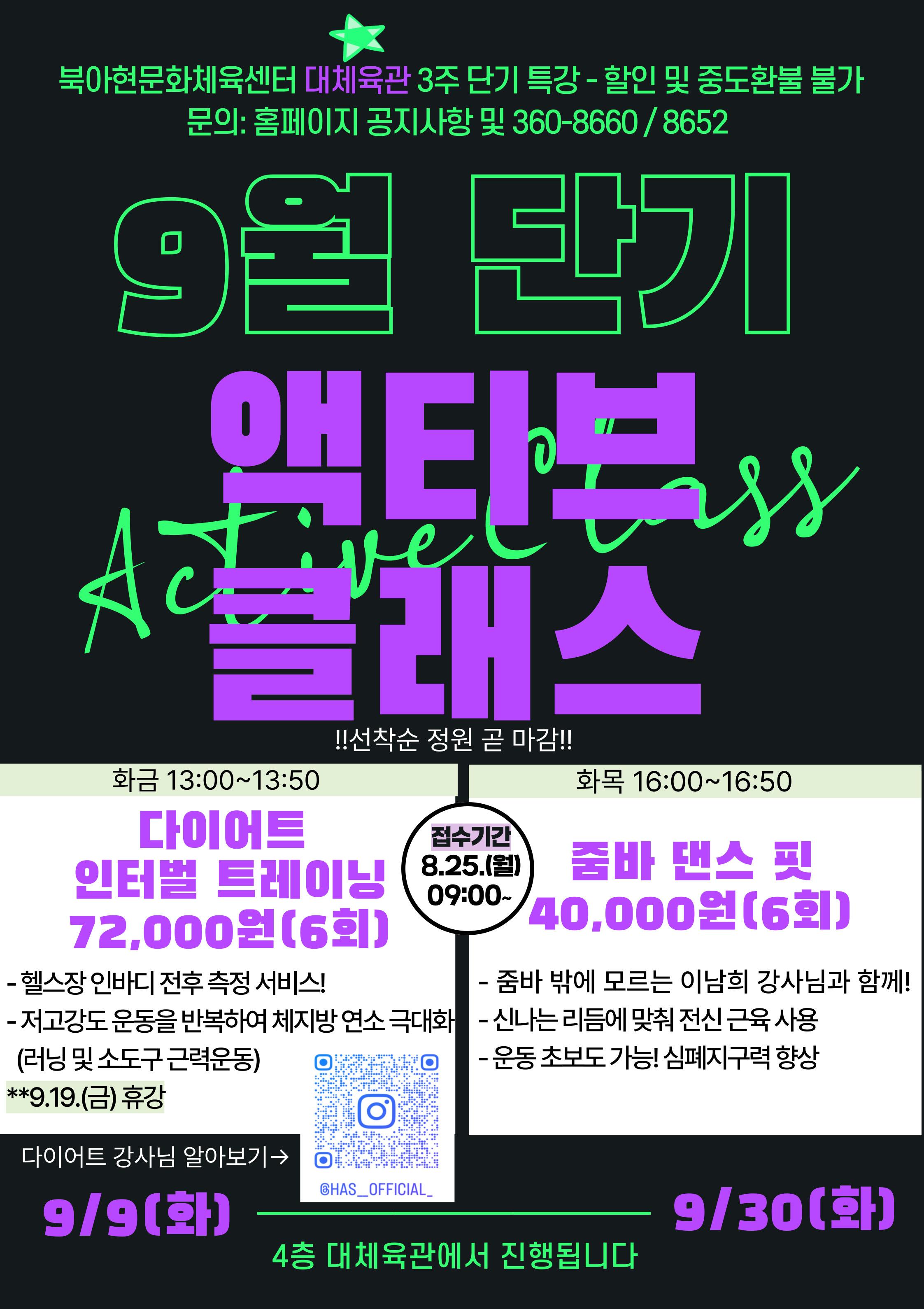 북아현문화체육센터 9월 단기 액티브 클래스(Active Class) 접수 안내