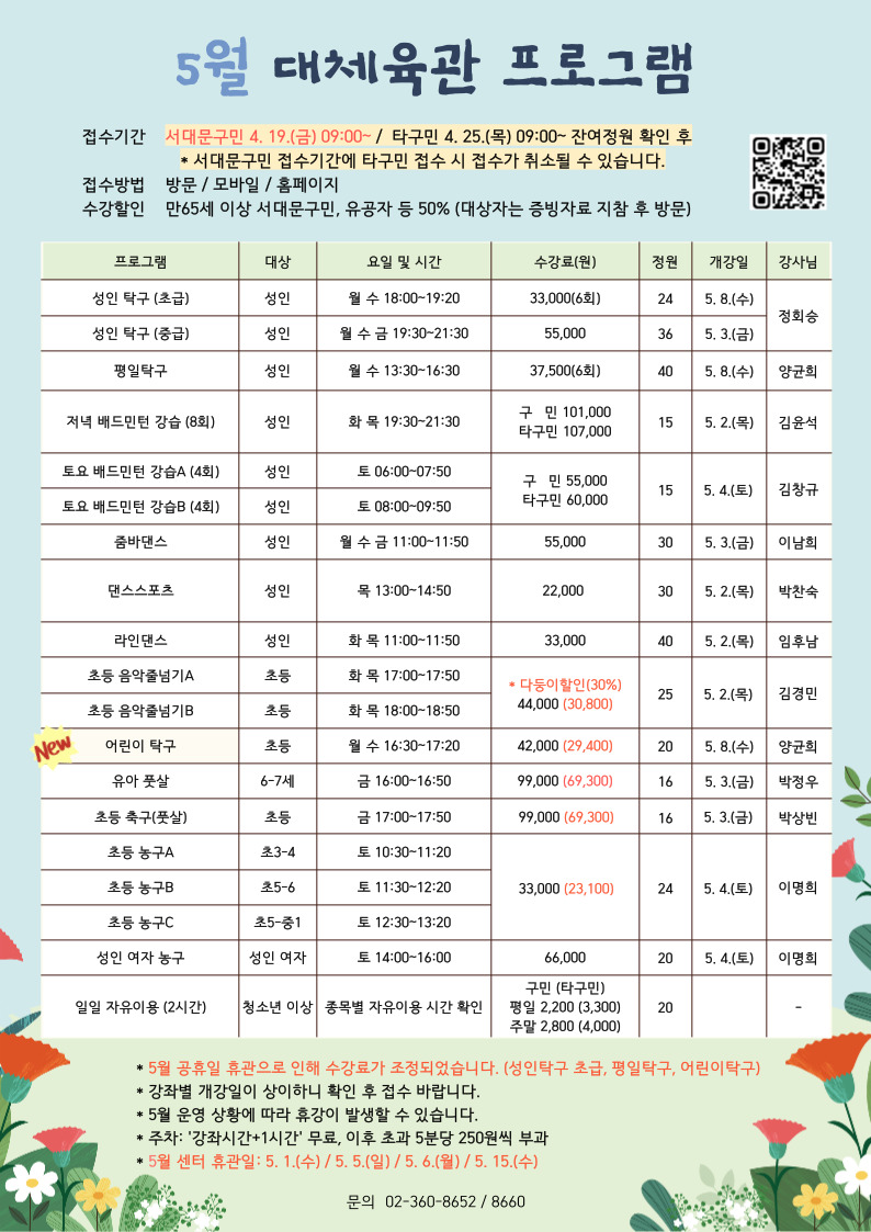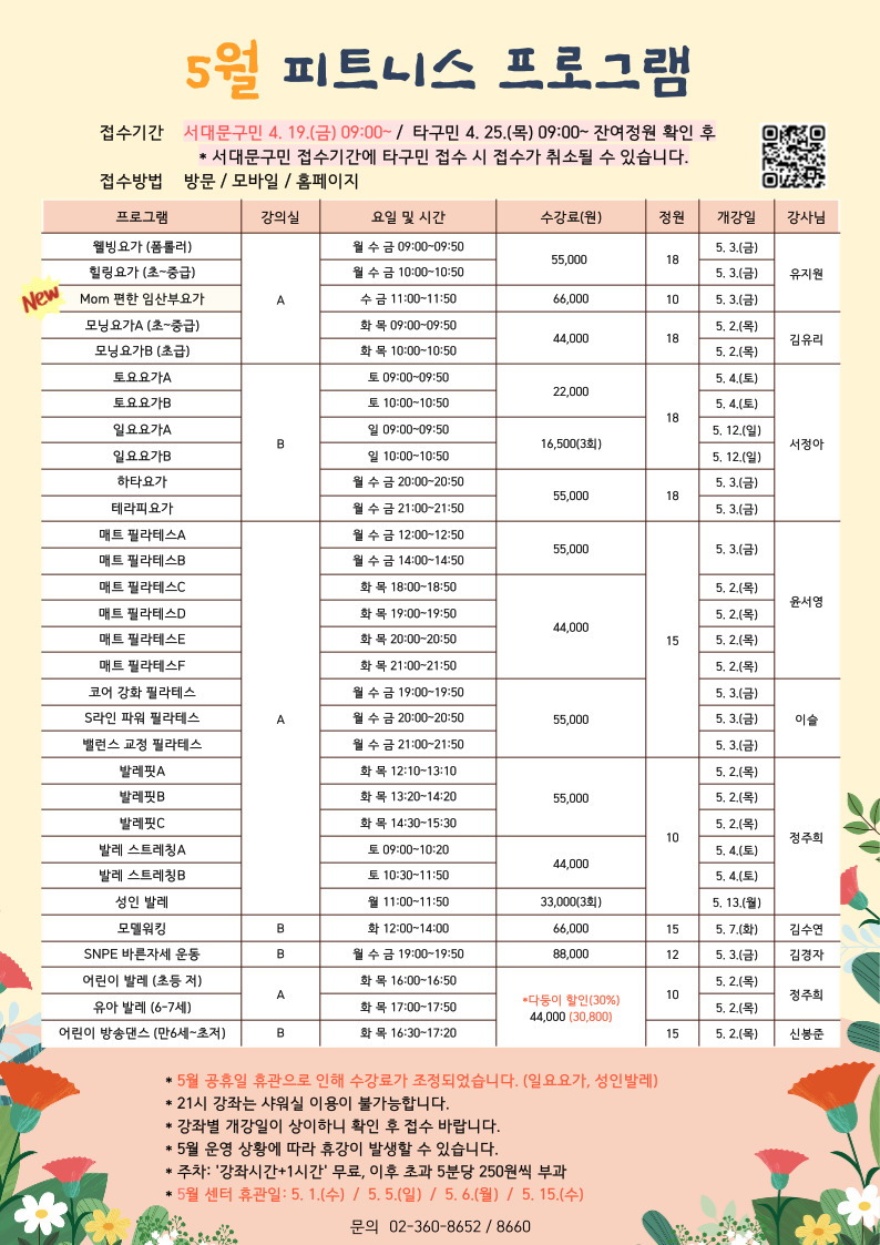 ★ 5월 센터 휴관일: 5. 1.(수) / 5. 5.(일) / 5. 6.(월) / 5. 15.(수)