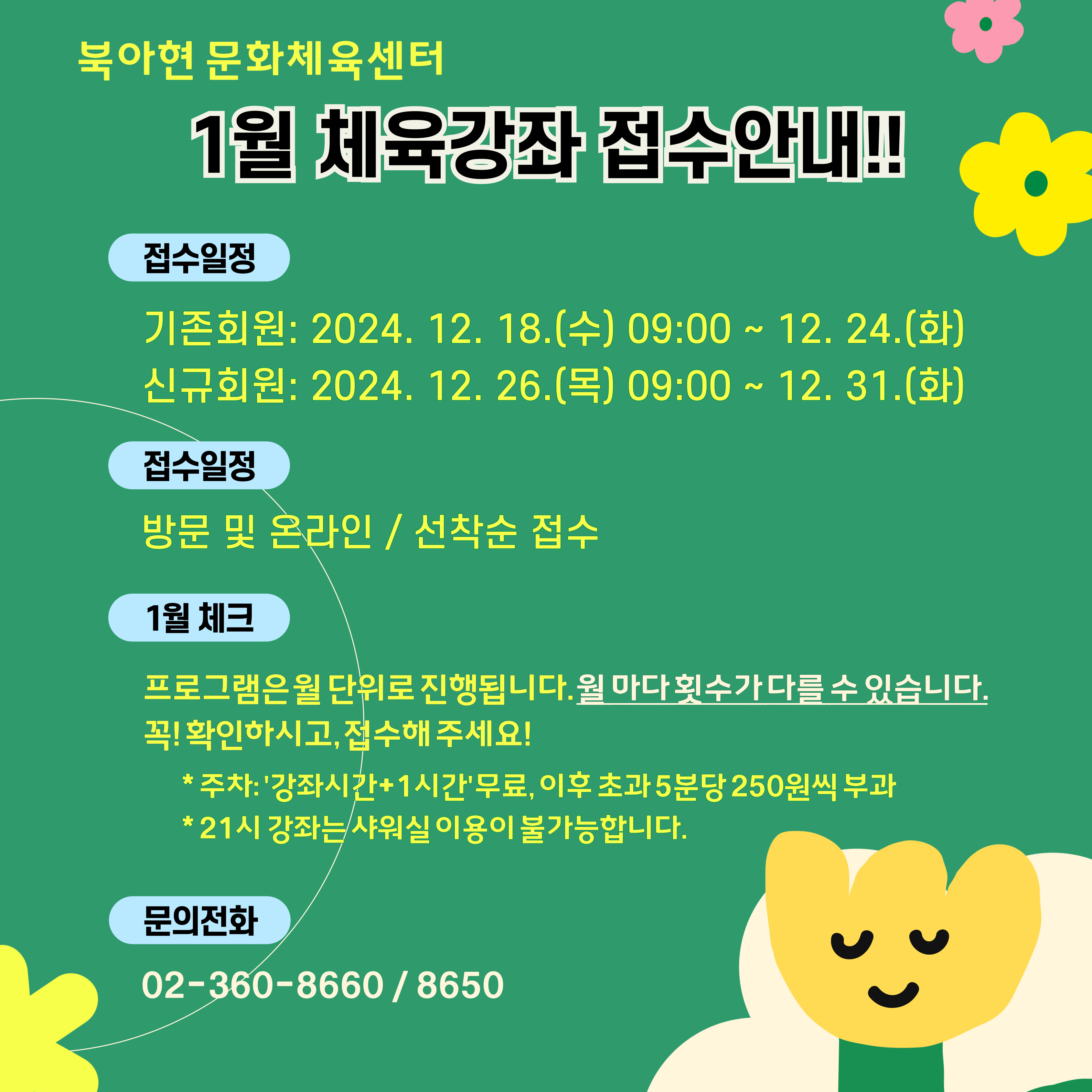 북아현문화체육센터 2025년 1월 체육강좌 접수 및 프로그램 안내