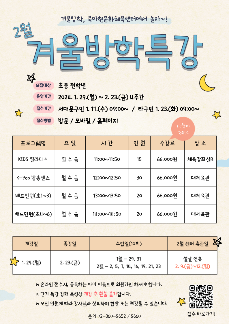 공지 북아현문화체육센터 2월 겨울방학 체육 특강 안내