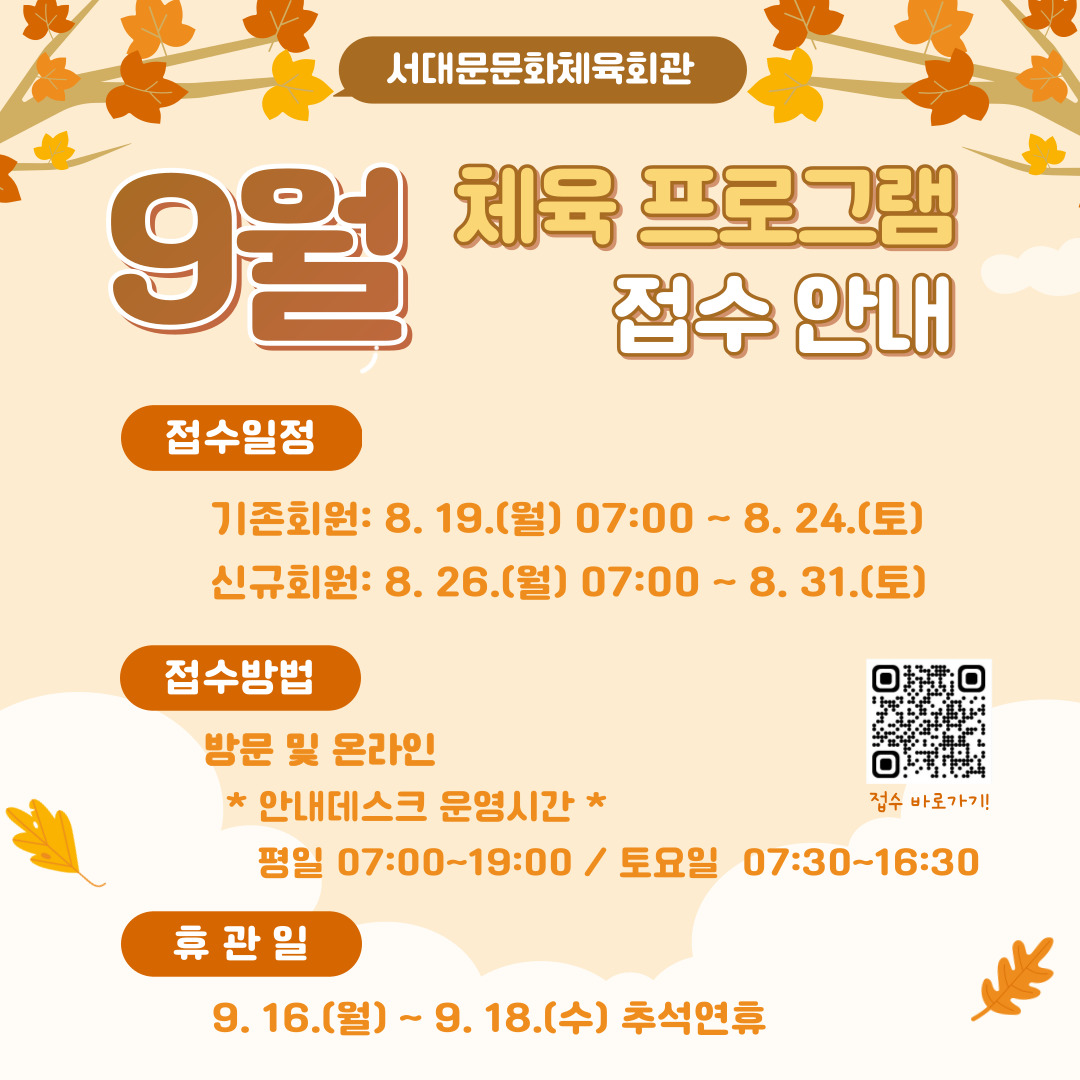 공지 서대문문화체육회관 9월 체육강좌 접수 및 휴관일 안내