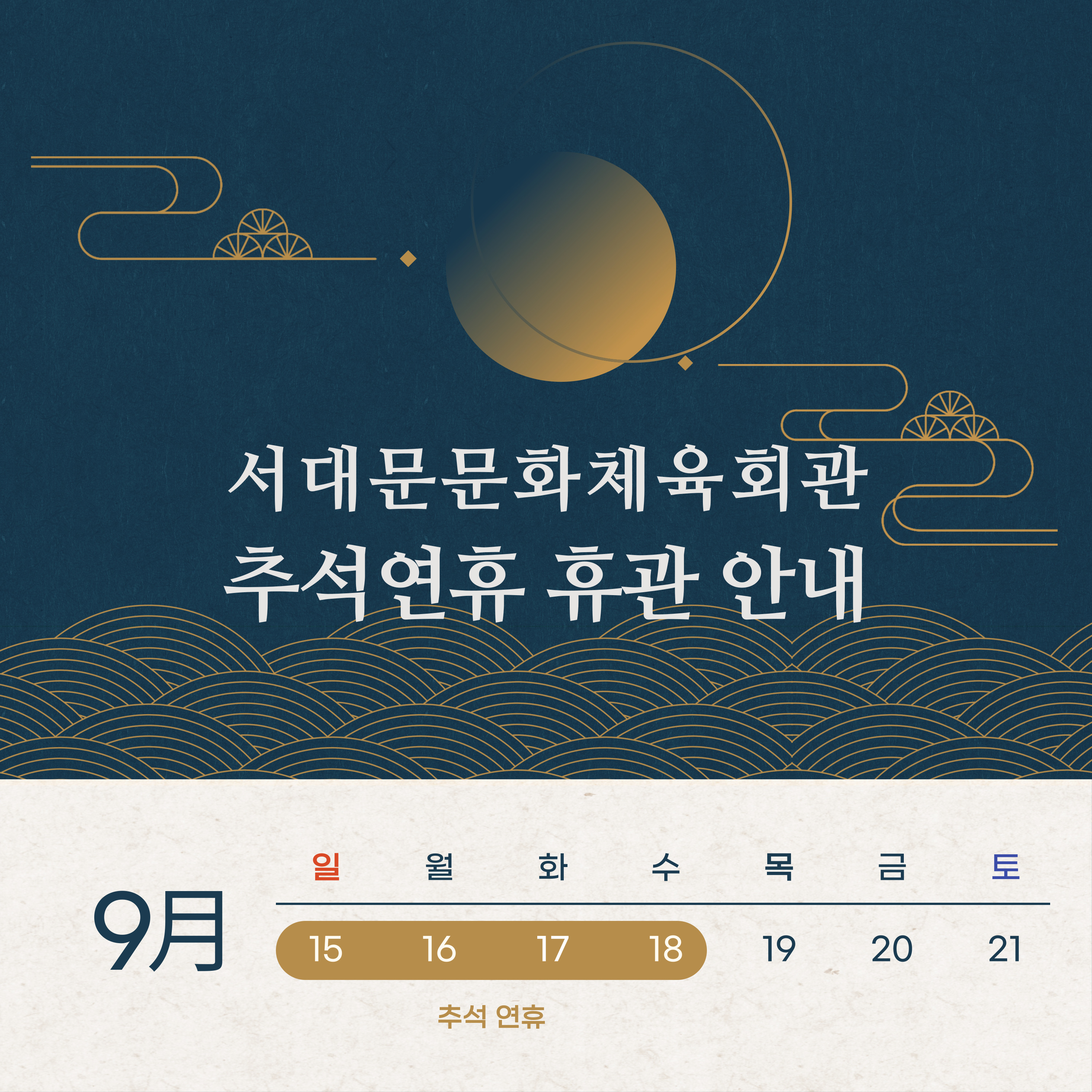 9월 15일(일)~9월 18일(수)은 추석연휴로 휴관입니다.