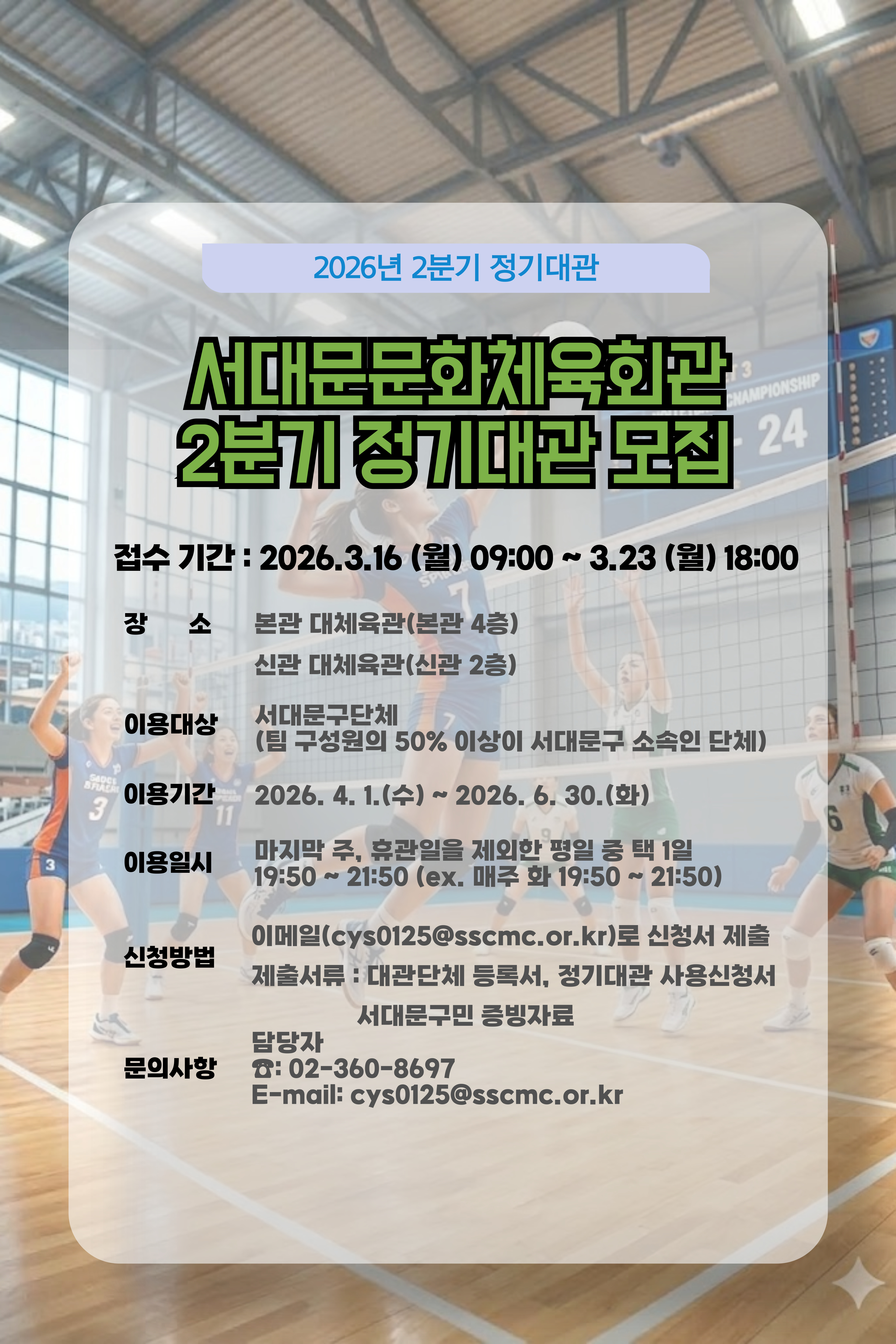 서대문문화체육회관 2026년 2분기 대체육관 정기대관 접수 안내
