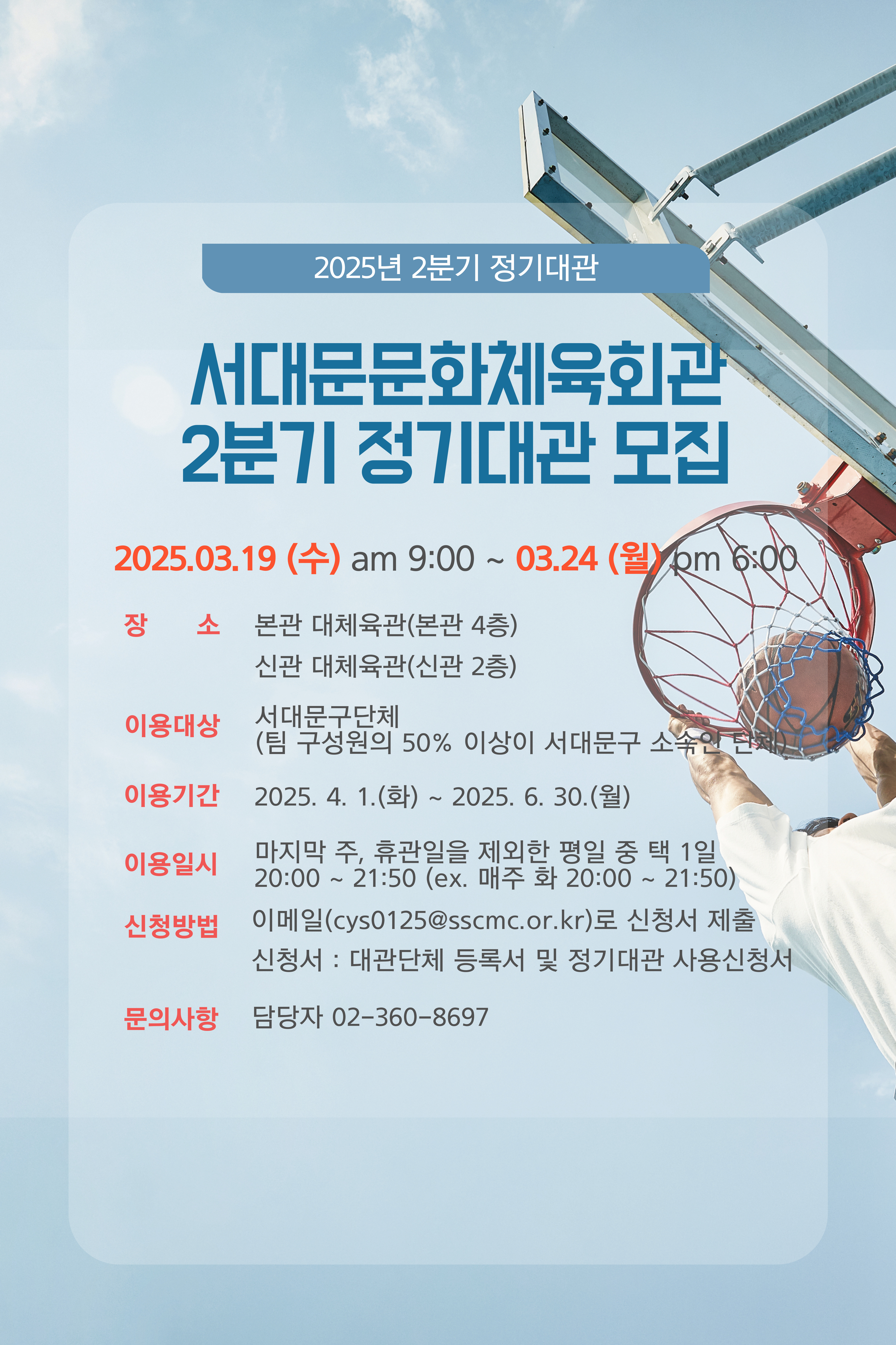 안녕하세요 서대문문화체육회관 2025년 2분기 대체육관 정기대관 접수 안내 드립니다.