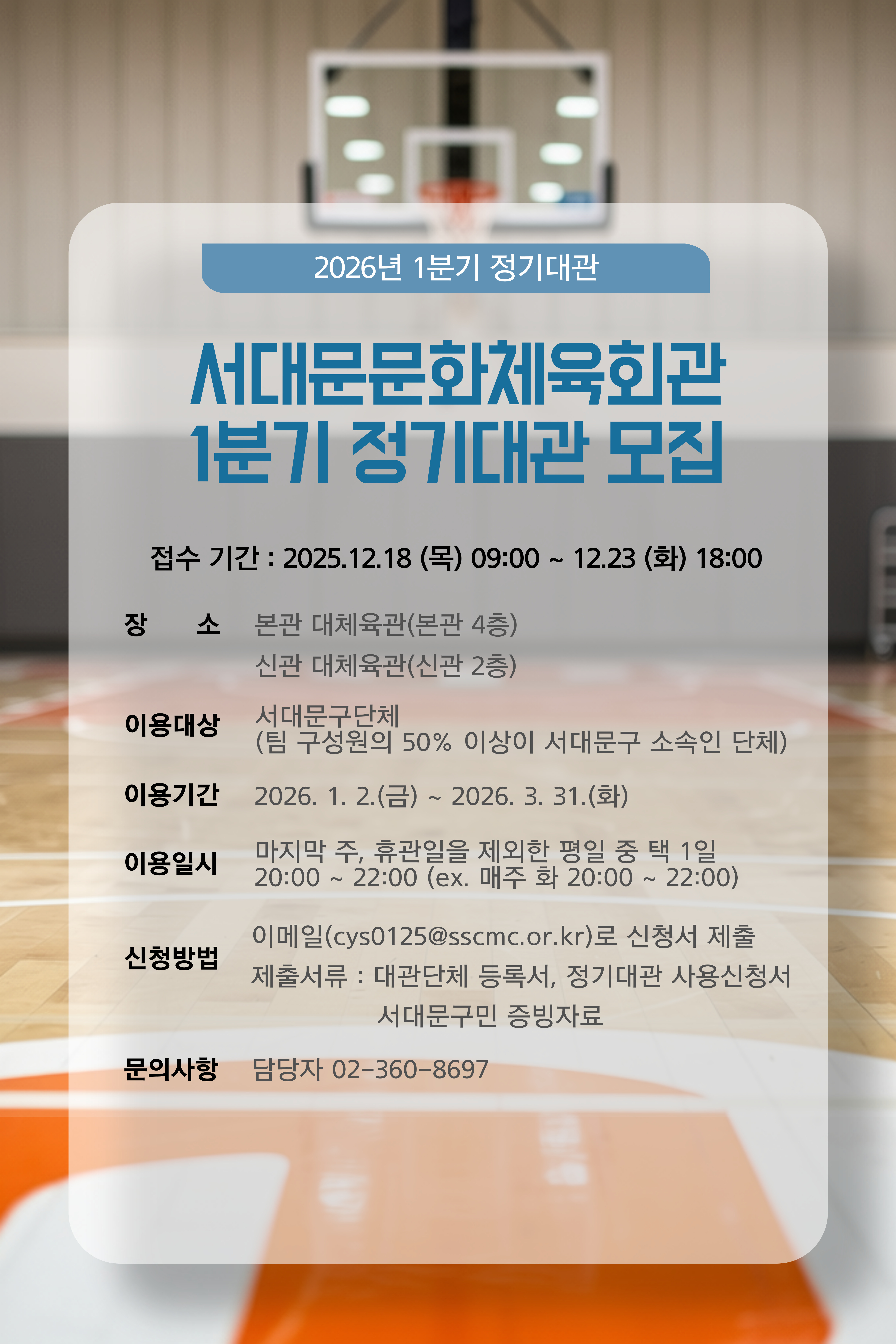 서대문문화체육회관 2026년 1분기 대체육관 정기대관 접수 안내