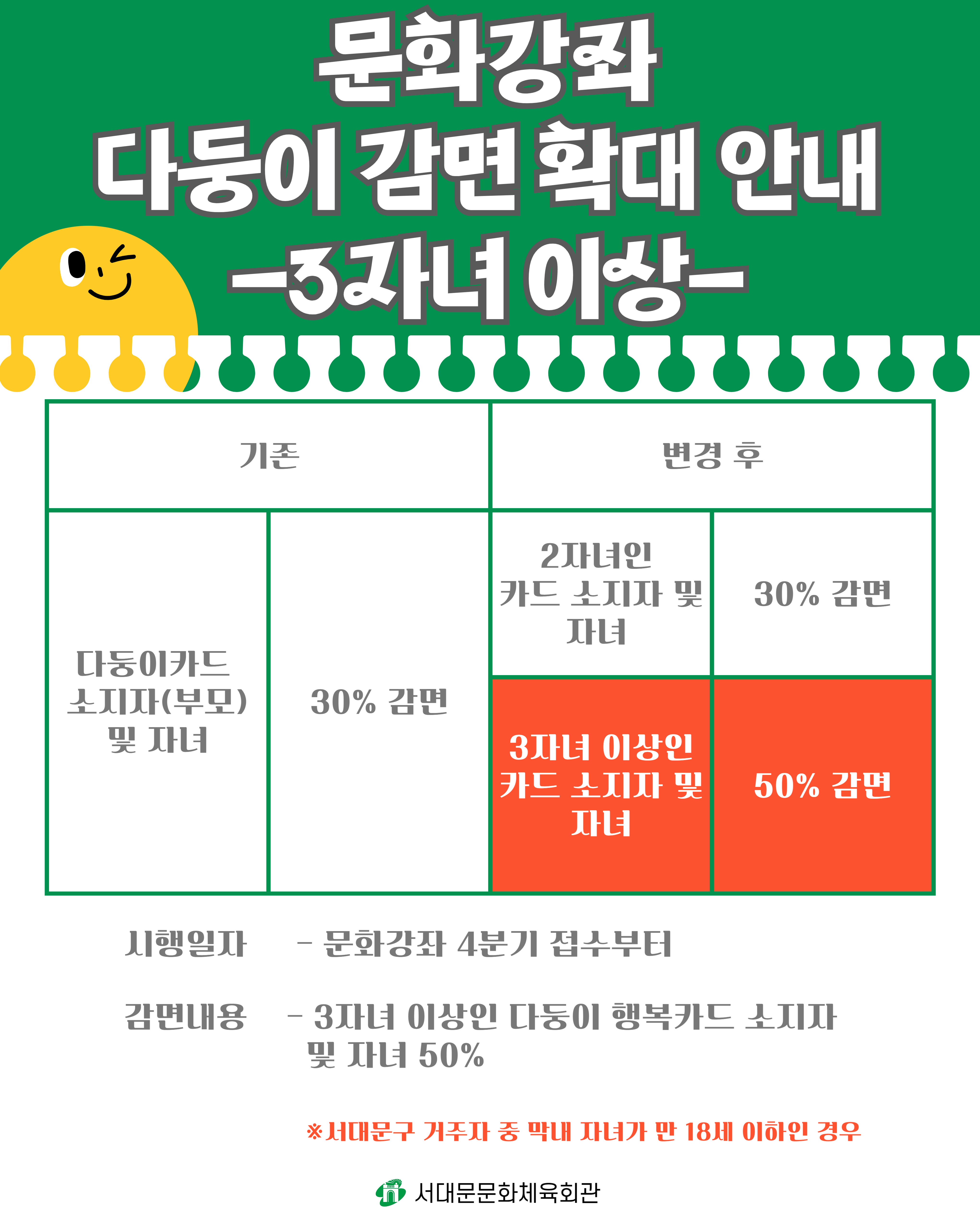 4분기 문화강좌 접수부터 다둥이카드 감면 제도가 확대되었습니다.