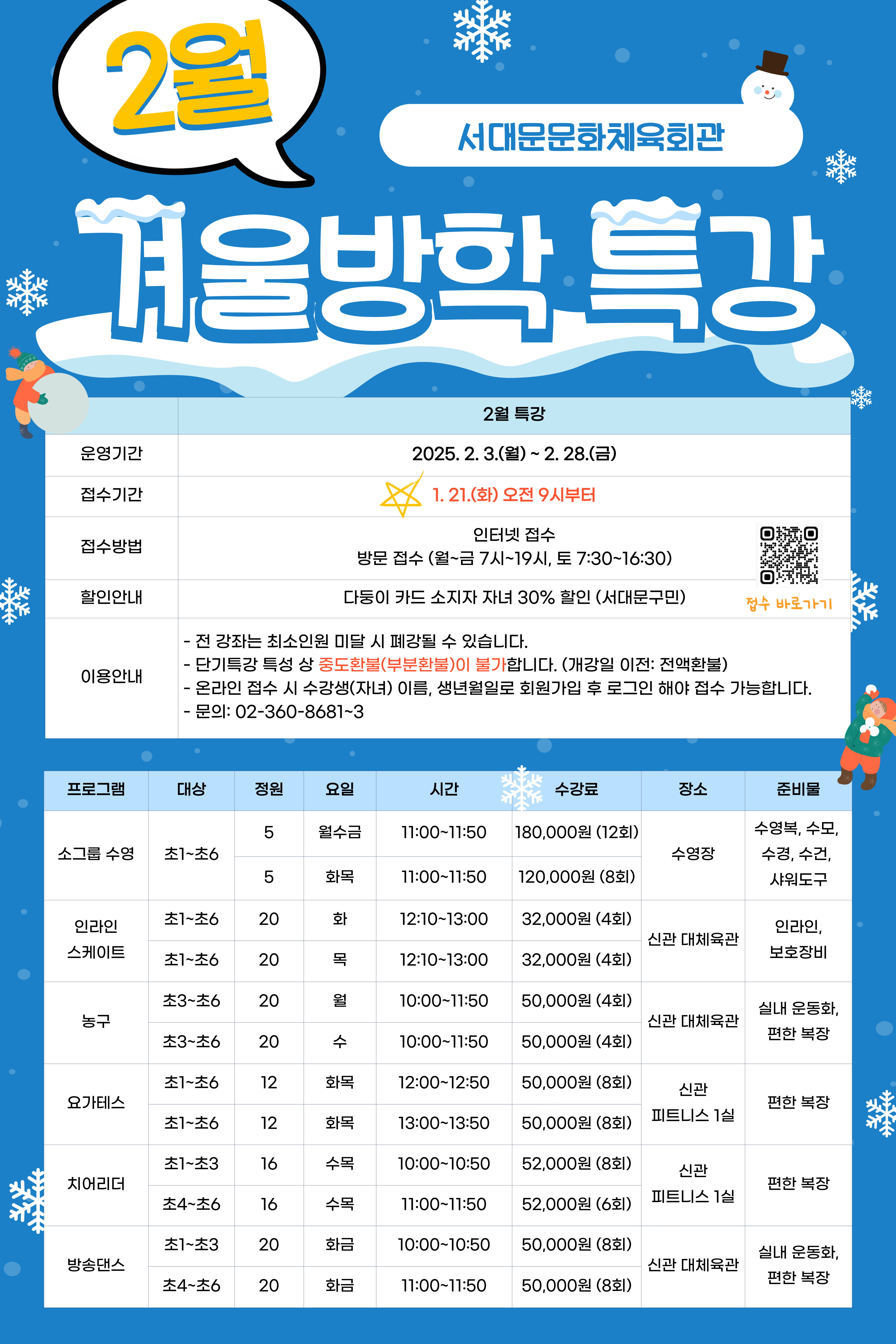 서대문문화체육회관 2월 겨울방학특강 접수 안내