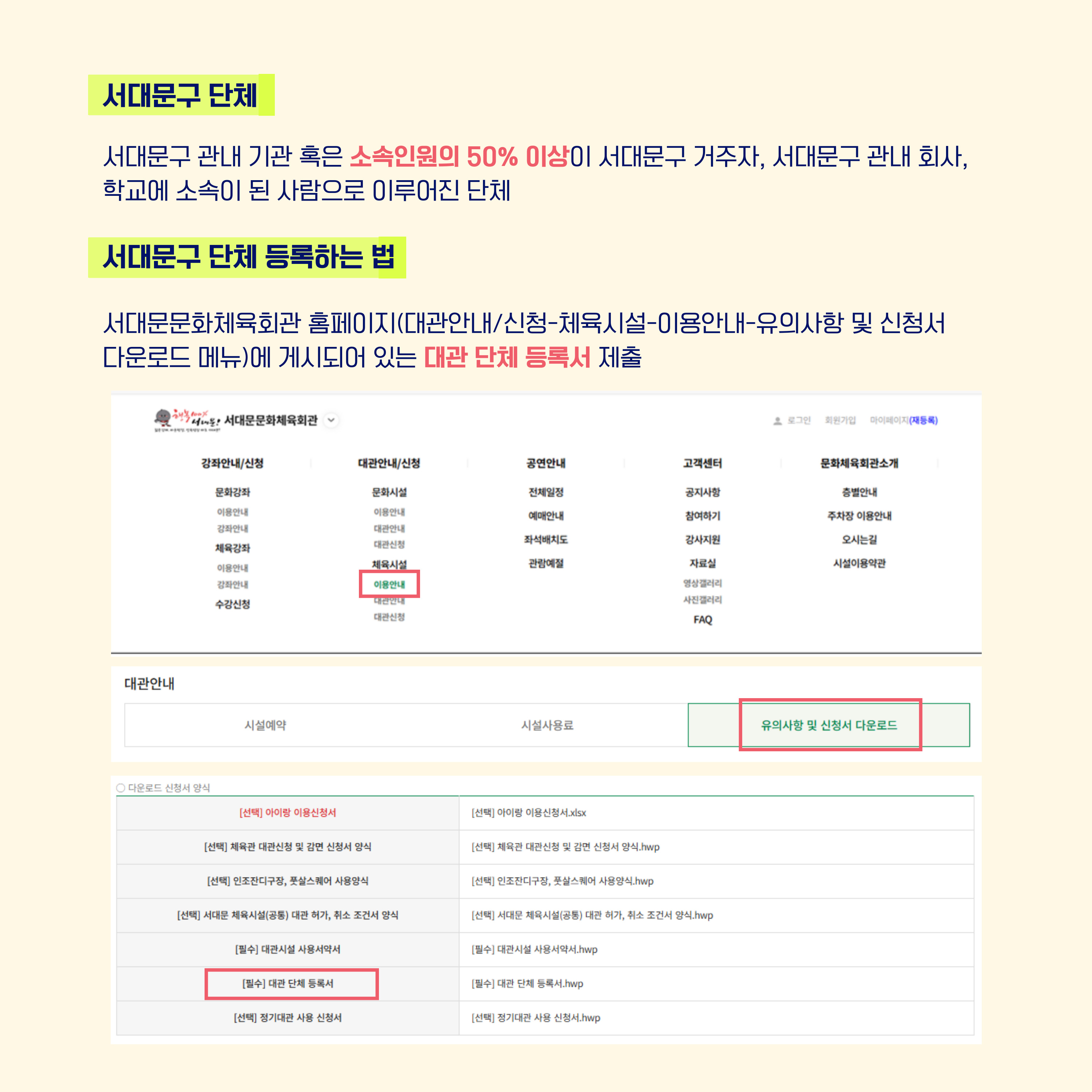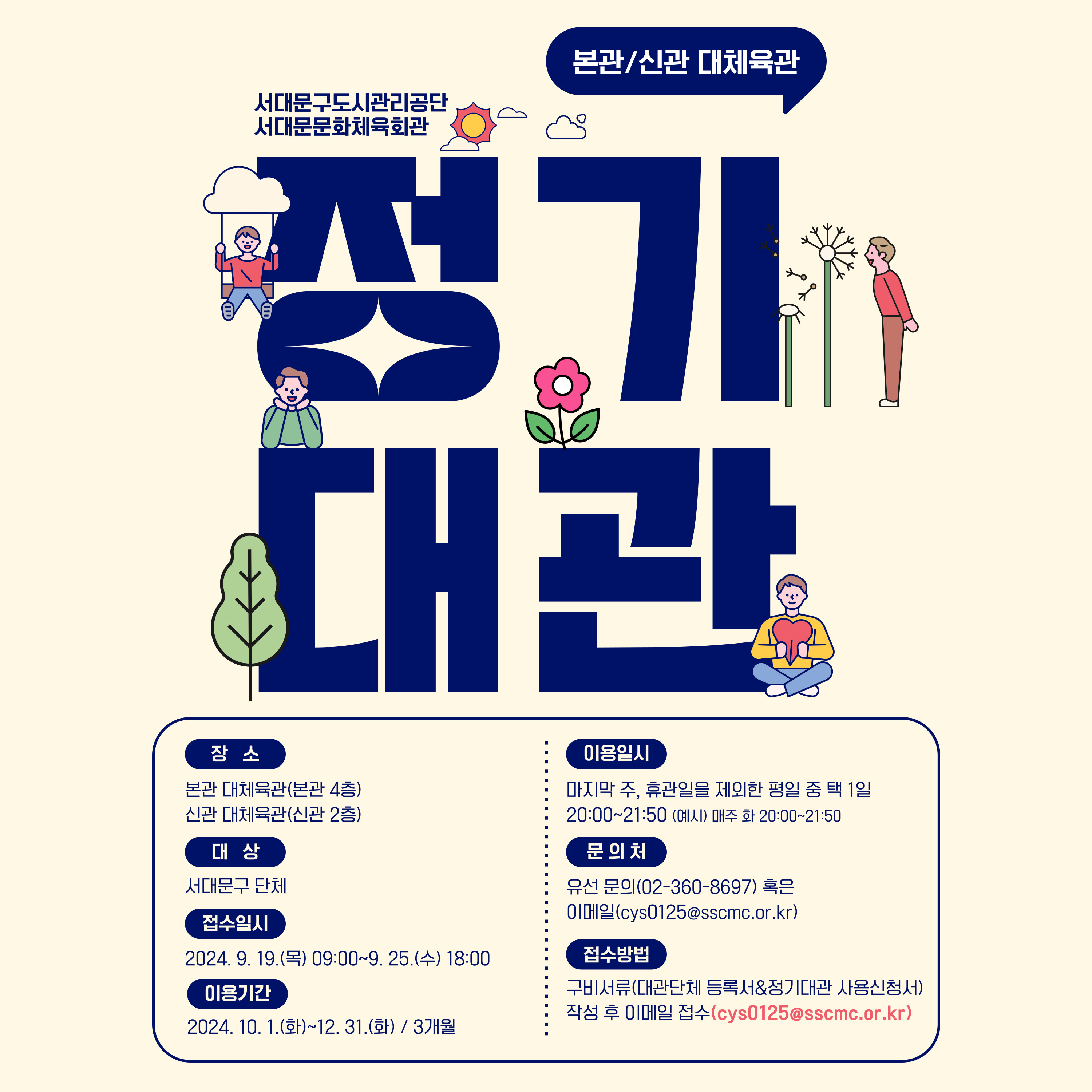 -접수방법: 구비서류(대관단체 등록서&정기대관 사용신청서) 작성 후 이메일 접수(cys0125@sscmc.or.kr)