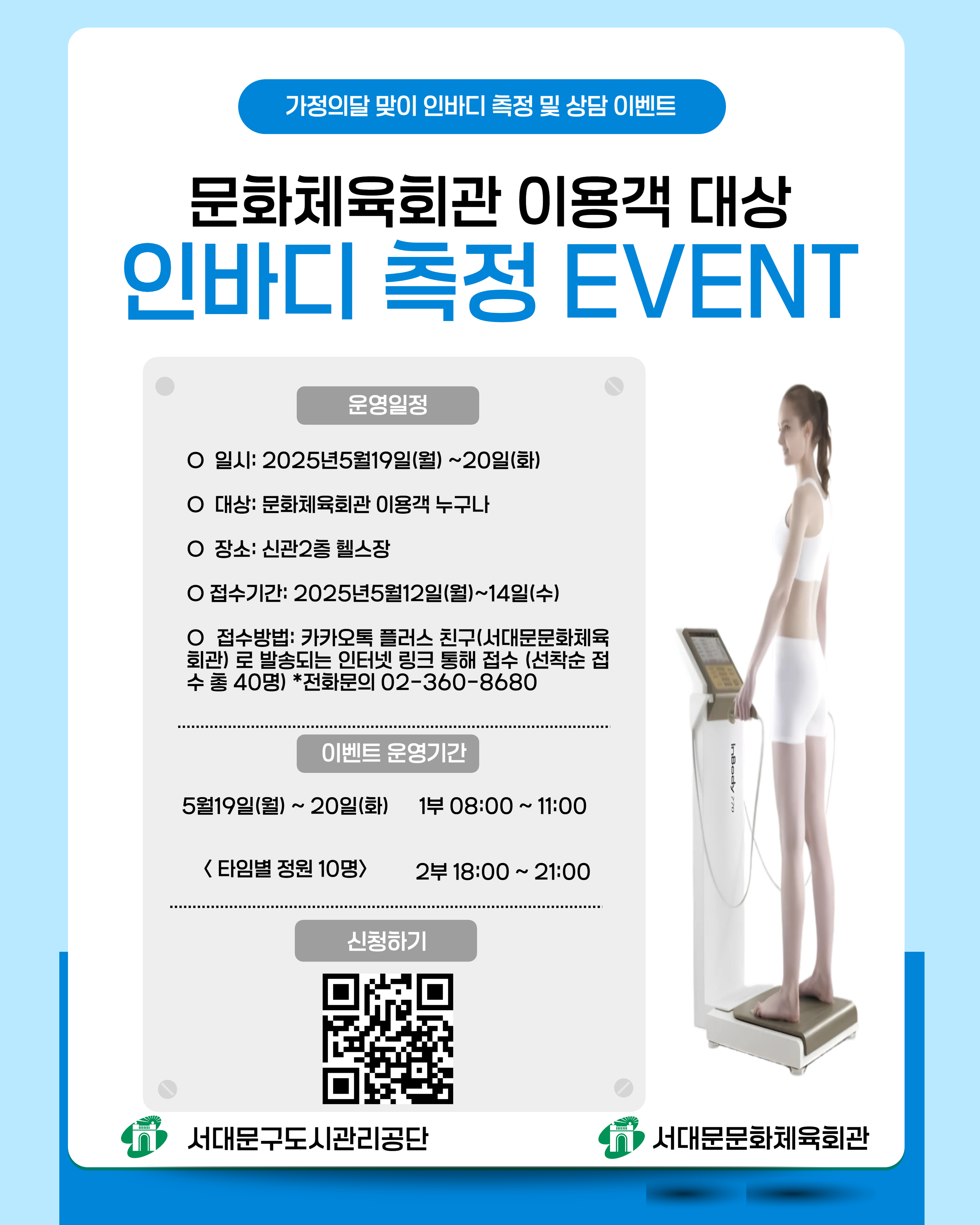 5월 가정의달을 맞아 문화체육회관에서 체성분 측정 및 상담 이벤트를 실시 합니다.