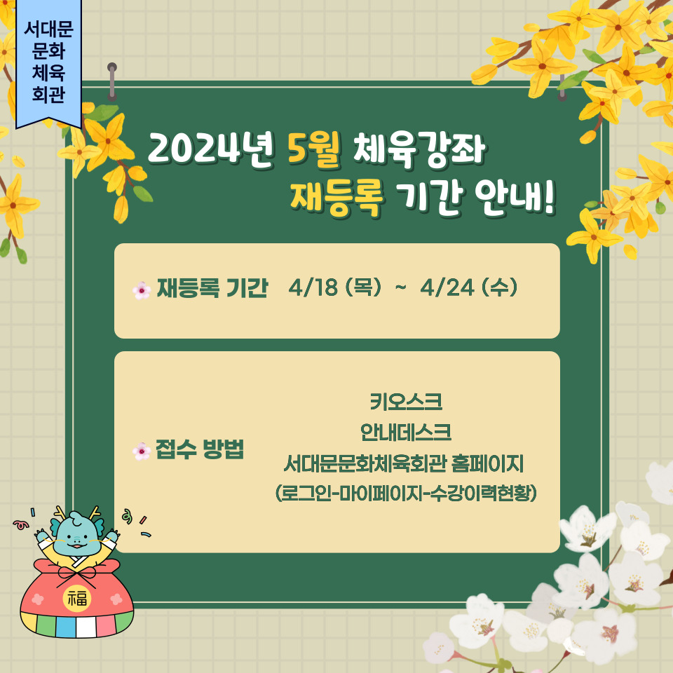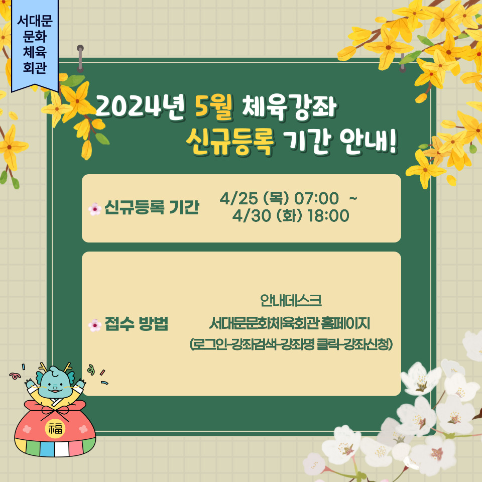 2024년 5월 체육강좌 접수 및 휴관 일정입니다.