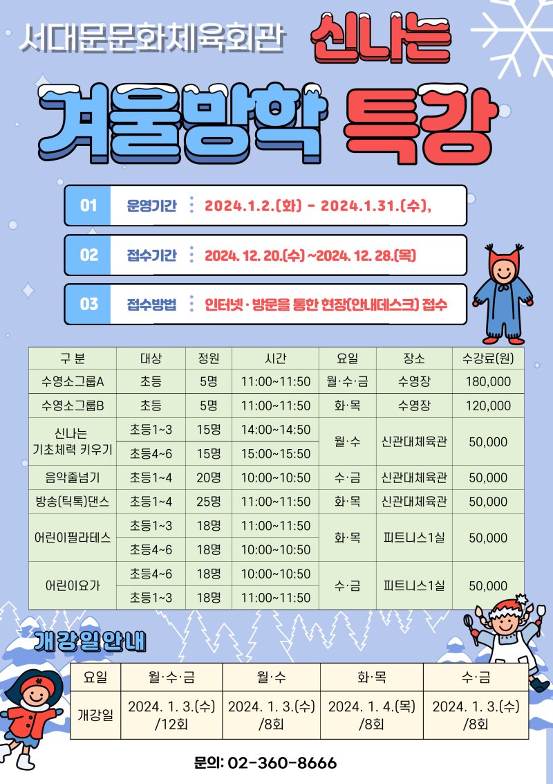 공지 2023년 문화체육회관 겨울방학특강 접수 안내
