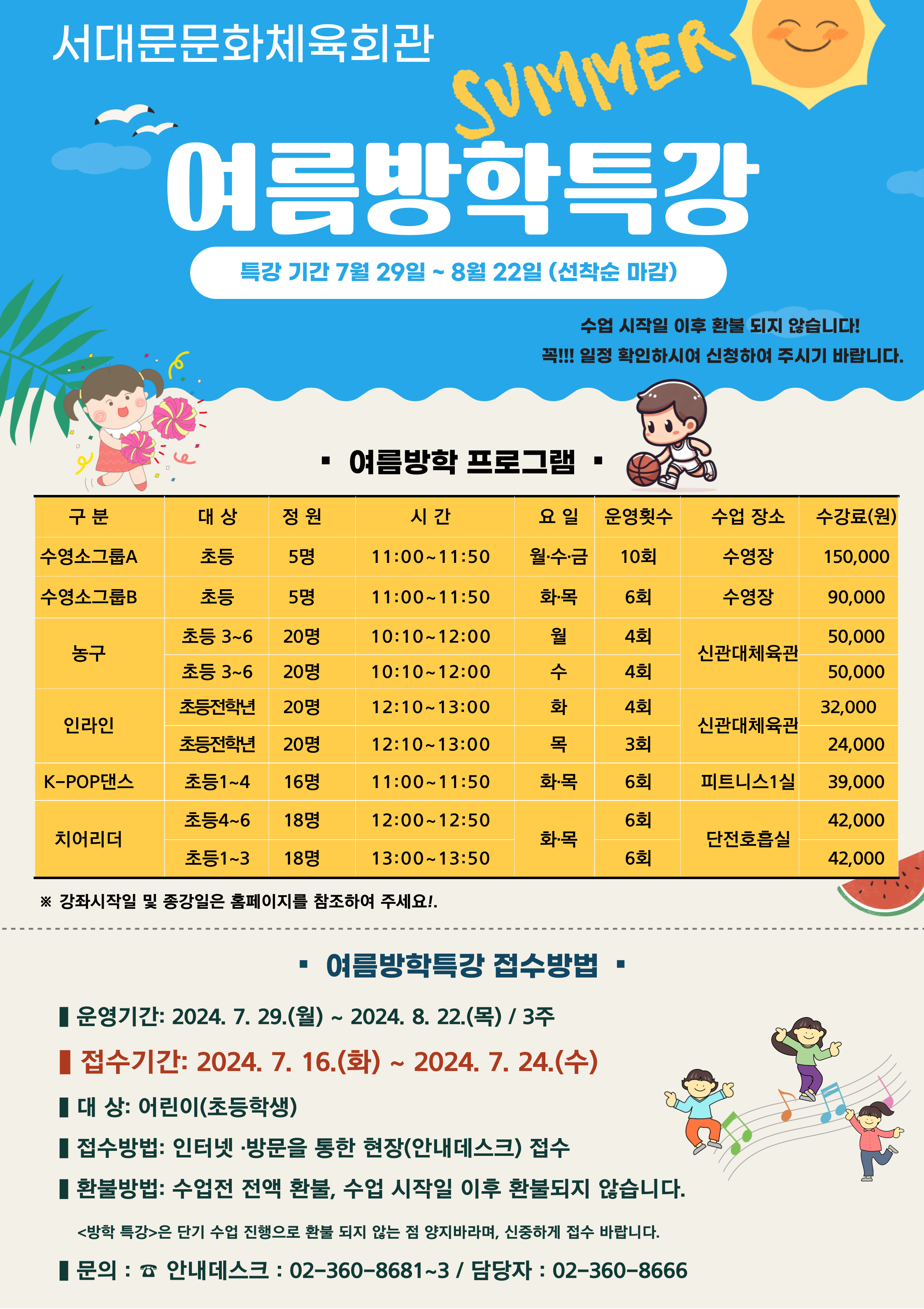 공지 서대문문화체육회관 방학특강 체육강좌 안내